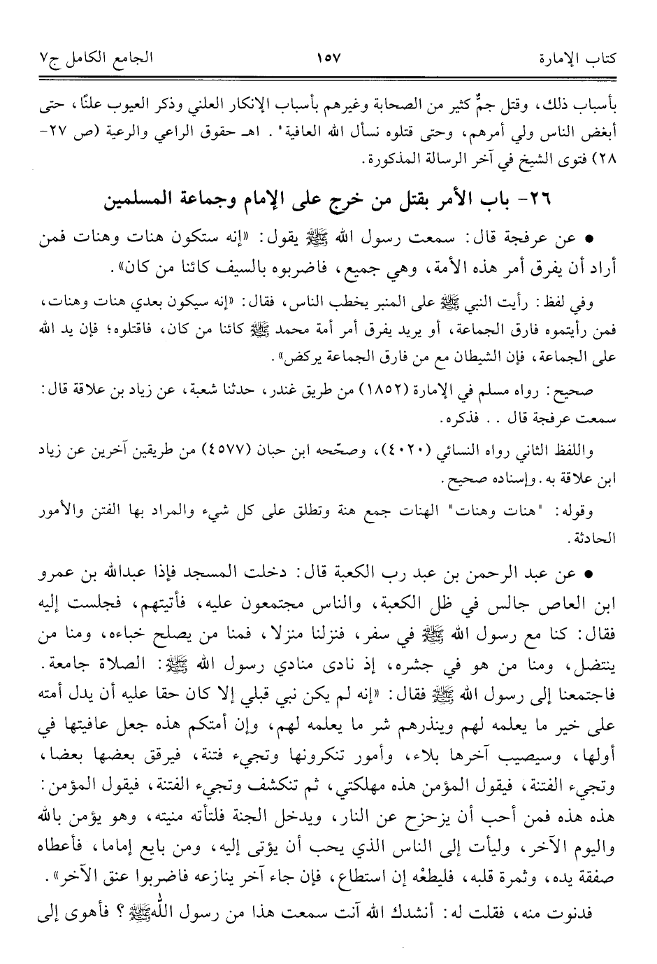 • عن عبد الرحمن بن عبد رب الكعبة قال: دخلت المسجد فإذا عبد الله بن عمرو بن العاص جالس في ظل الكعبة، والناس مجتمعون عليه، فأتيتهم، فجلست إليه فقال: كنا مع رسول الله صلى الله عليه وسلم في سفر، فنزلنا منزلا، فمنا من يصلح خباءه، ومنا من ينتضل، ومنا من هو في جشره، إذ نادى منادي رسول الله - صلى الله عليه وسلم -: الصلاة جامعة. فاجتمعنا إلى رسول الله صلى الله عليه وسلم فقال: "إنه لم يكن نبي قبلي إلا كان حقا عليه أن يدل أمته على خير ما يعلمه لهم وينذرهم شر ما يعلمه لهم، وإن أمتكم هذه جعل عافيتها في أولها، وسيصيب آخرها بلاء، وأمور تنكرونها وتجيء فتنة، فيرقق بعضها بعضا، وتجيء الفتنة، فيقول المؤمن هذه مهلكتي، ثم تنكشف وتجيء الفتنة، فيقول المؤمن: هذه هذه فمن أحب أن يزحزح عن النار، ويدخل الجنة فلتأته منيته، وهو يؤمن بالله واليوم الآخر، وليأت إلى الناس الذي يحب أن يؤتى إليه، ومن بايع إماما، فأعطاه صفقة يده، وثمرة قلبه، فليطعه إن استطاع، فإن جاء آخر ينازعه فاضربوا عنق الآخر".