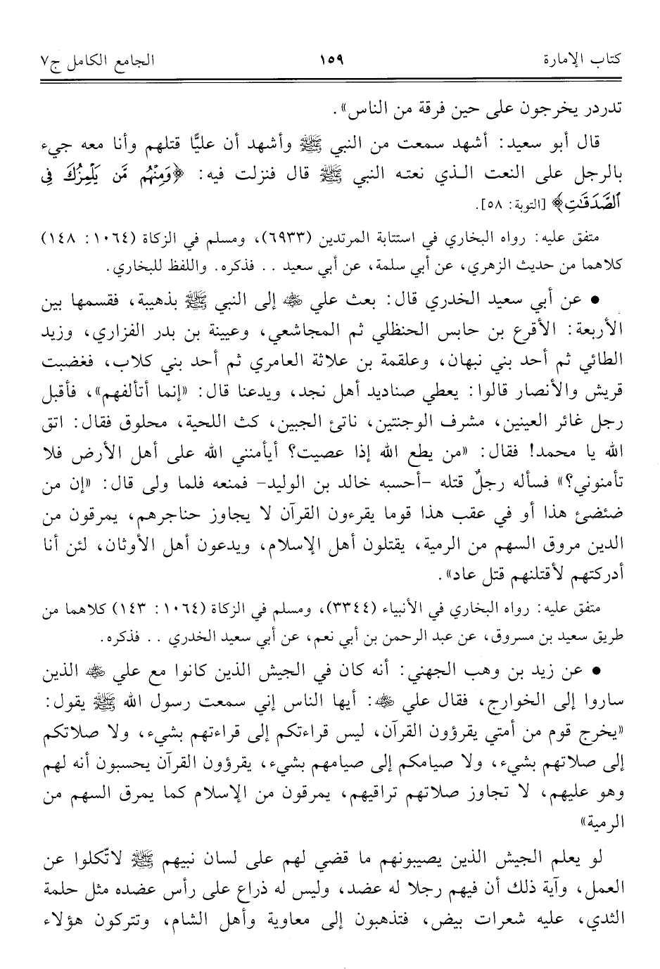 • عن زيد بن وهب الجهني: أنه كان في الجيش الذين كانوا مع علي - رضي الله عنه - الذين ساروا إلى الخوارج، فقال علي - رضي الله عنه -: أيها الناس إني سمعت رسول الله صلى الله عليه وسل - يقول: "يخرج قوم من أمتي يقرؤون القرآن، ليس قراءتكم إلى قراءتهم بشيء، ولا صلاتكم إلى صلاتهم بشيء، ولا صيامكم إلى صيامهم بشيء، يقرؤون القرآن يحسبون أنه لهم وهو عليهم، لا تجاوز صلاتهم تراقيهم، يمرقون من الإسلام كما يمرق السهم من الرمية".