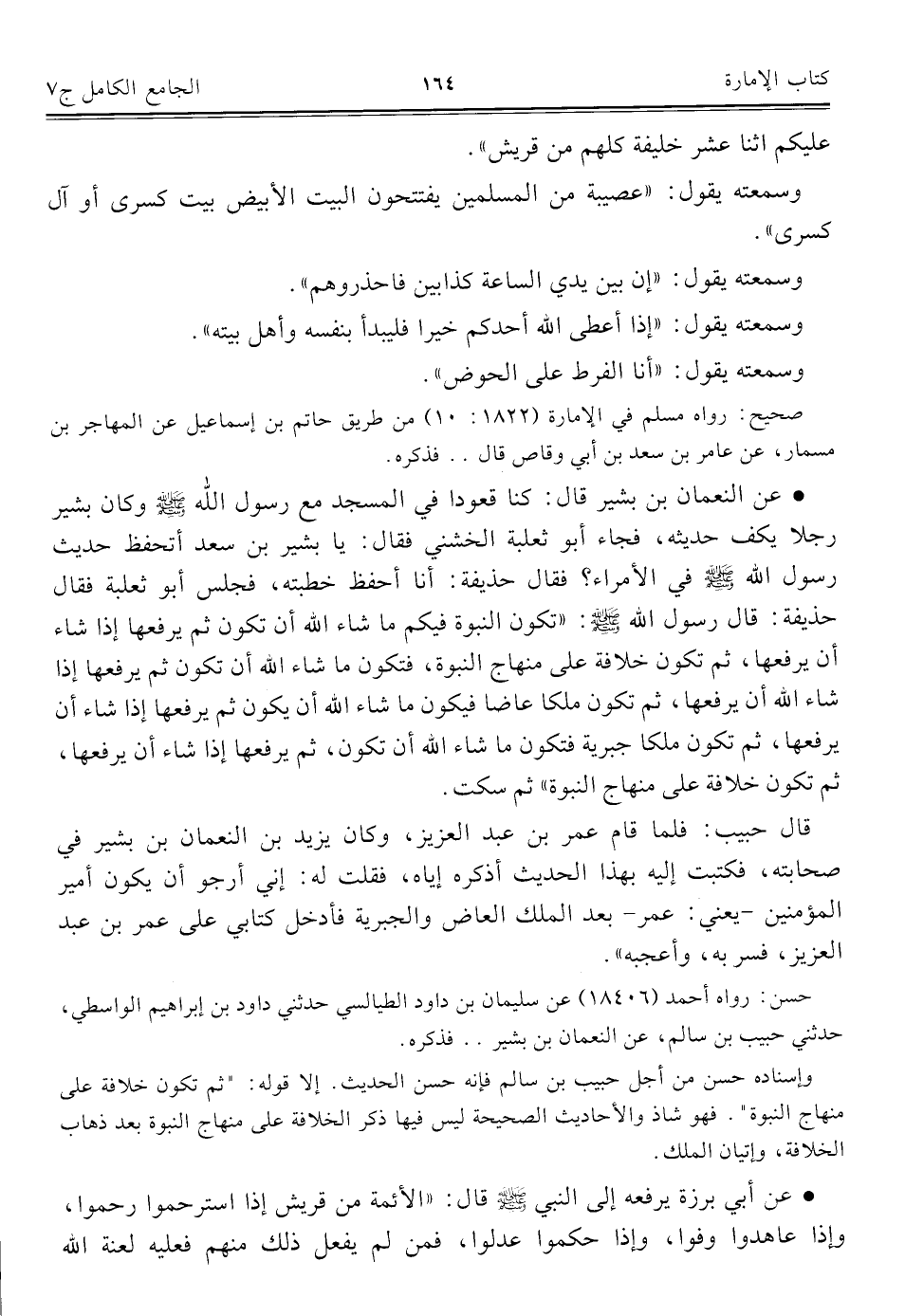• عن النعمان بن بشير قال: كنا قعودا في المسجد مع رسول الله - صلى الله عليه وسلم - وكان بشير رجلا يكف حديثه، فجاء أبو ثعلبة الخشني فقال: يا بشير بن سعد أتحفظ حديث رسول الله - صلى الله عليه وسلم - في الأمراء؟ فقال حذيفة: أنا أحفظ خطبته، فجلس أبو ثعلبة فقال حذيفة: قال رسول الله - صلى الله عليه وسلم -: "تكون النبوة فيكم ما شاء الله أن تكون ثم يرفعها إذا شاء أن يرفعها، ثم تكون خلافة على منهاج النبوة، فتكون ما شاء الله أن تكون ثم يرفعها إذا شاء الله أن يرفعها، ثم تكون ملكا عاضا فيكون ما شاء الله أن يكون ثم يرفعها إذا شاء أن يرفعها، ثم تكون ملكا جبرية فتكون ما شاء الله أن تكون، ثم يرفعها إذا شاء أن يرفعها، ثم تكون خلافة على منهاج النبوة" ثم سكت.