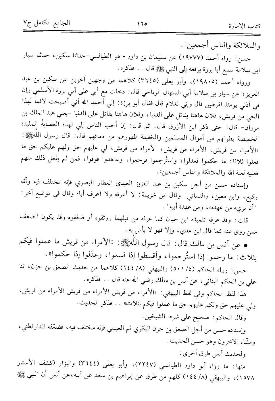 هذا لفظ الحاكم وفي لفظ البيهقي: "الأمراء من قريش الأمراء من قريش الأمراء من قريش، ولي عليهم حق ولكم عليهم حق ما عملوا فيكم بثلاث" .. فذكر الحديث.
