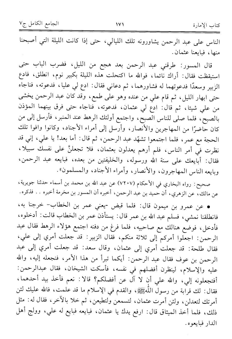 • عن عمرو بن ميمون قال: فلما قبض - يعني عمر بن الخطاب - خرجنا به، فانطلقنا نمشي، فسلم عبد الله بن عمر قال: يستأذن عمر بن الخطاب قالت: أدخلوه، فأدخل، فوضع هنالك مع صاحبيه، فلما فرغ من دفنه اجتمع هؤلاء الرهط فقال عبد الرحمن: اجعلوا أمركم إلى ثلاثة منكم، فقال الزبير: قد جعلت أمري إلى علي، فقال طلحة: قد جعلت أمري إلى عثمان، وقال سعد: قد جعلت أمري إلى عبد الرحمن بن عوف فقال عبد الرحمن: أيكما تبرأ من هذا الأمر، فنجعله إليه، والله عليه والإسلام، لينظرن أفضلهم في نفسه، فأسكت الشيخان، فقال عبد الرحمن: أفتجعلونه إلي، والله على أن لا آل عن أفضلكم؟ قالا: نعم فأخذ بيد أحدهما، فقال: لك قرابة من رسول الله - صلى الله عليه وسلم -، والقدم في الإسلام ما قد علمت، فالله عليك لئن أمرتك لتعدلن، ولئن أمرت عثمان، لتسمعن ولتطيعن، ثم خلا بالآخر، فقال له: مثل ذلك، فلما أخذ الميثاق قال: ارفع يدك يا عثمان، فبايعه فبايع له علي، وولج أهل الدار فبايعوه.