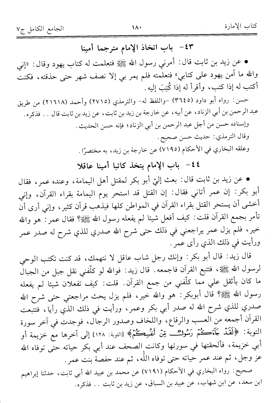 • عن زيد بن ثابت قال: بعث إلي أبو بكر لمقتل أهل اليمامة، وعنده عمر، فقال أبو بكر: إن عمر أتاني فقال: إن القتل قد استحر يوم اليمامة بقراء القرآن، وإني أخشى أن يستحر القتل بقراء القرآن في المواطن كلها فيذهب قرآن كثير، وإني أرى أن تأمر بجمع القرآن قلت: كيف أفعل شيئًا لم يفعله رسول الله - صلى الله عليه وسلم -؟ فقال عمر: هو والله خير، فلم يزل عمر يراجعني في ذلك حتى شرح الله صدري للذي شرح له صدر عمر ورأيت في ذلك الذي رأى عمر.