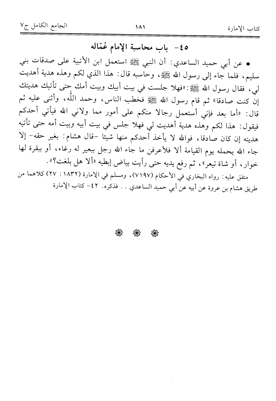 متفق عليه: رواه البخاري في الأحكام (٧١٩٧)، ومسلم في الإمارة (١٨٣٢: ٢٧) كلاهما من طريق هشام بن عروة عن أبيه عن أبي حميد الساعدي .. فذكره. ٤٢ - كتاب الإمارة