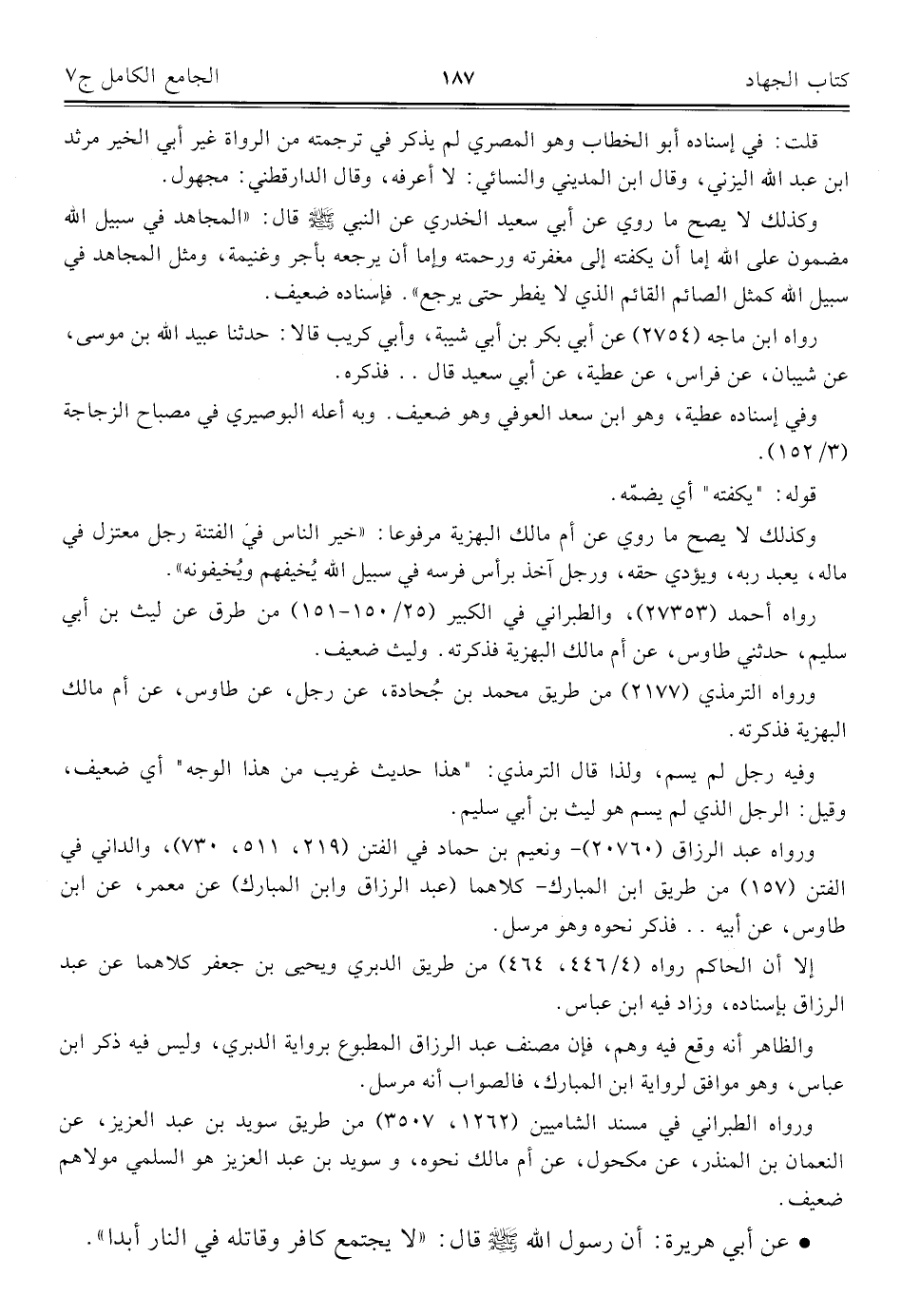 وكذلك لا يصح ما روي عن أبي سعيد الخدري عن النبي - صلى الله عليه وسلم - قال: "المجاهد في سبيل الله مضمون على الله إما أن يكفته إلى مغفرته ورحمته وإما أن يرجعه بأجر وغنيمة، ومثل المجاهد في سبيل الله كمثل الصائم القائم الذي لا يفطر حتى يرجع". فإسناده ضعيف.