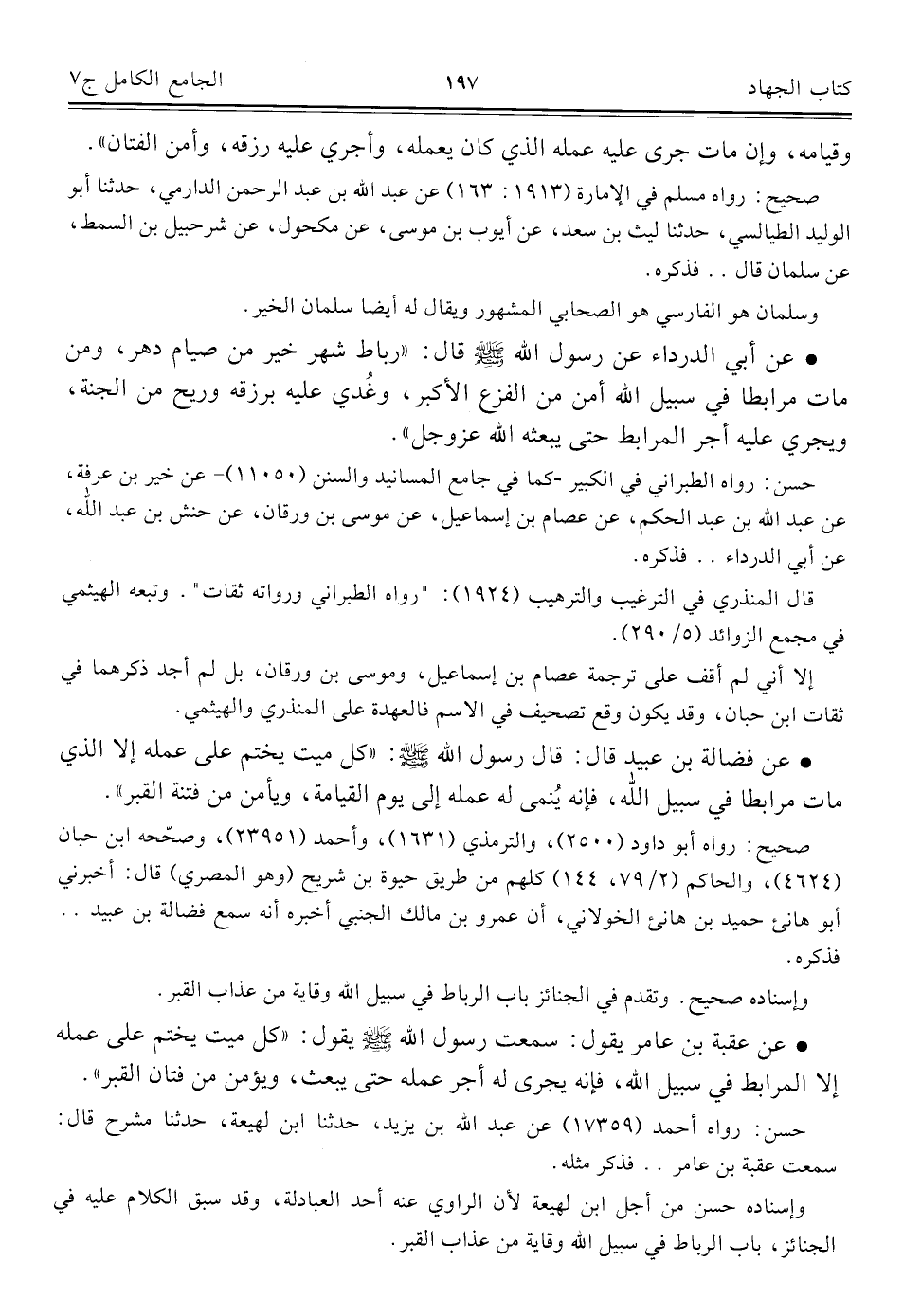 • عن عقبة بن عامر يقول: سمعت رسول الله - صلى الله عليه وسلم - يقول: "كل ميت يختم على عمله إلا المرابط في سبيل الله، فإنه يجرى له أجر عمله حتى يبعث، ويؤمن من فتان القبر".
