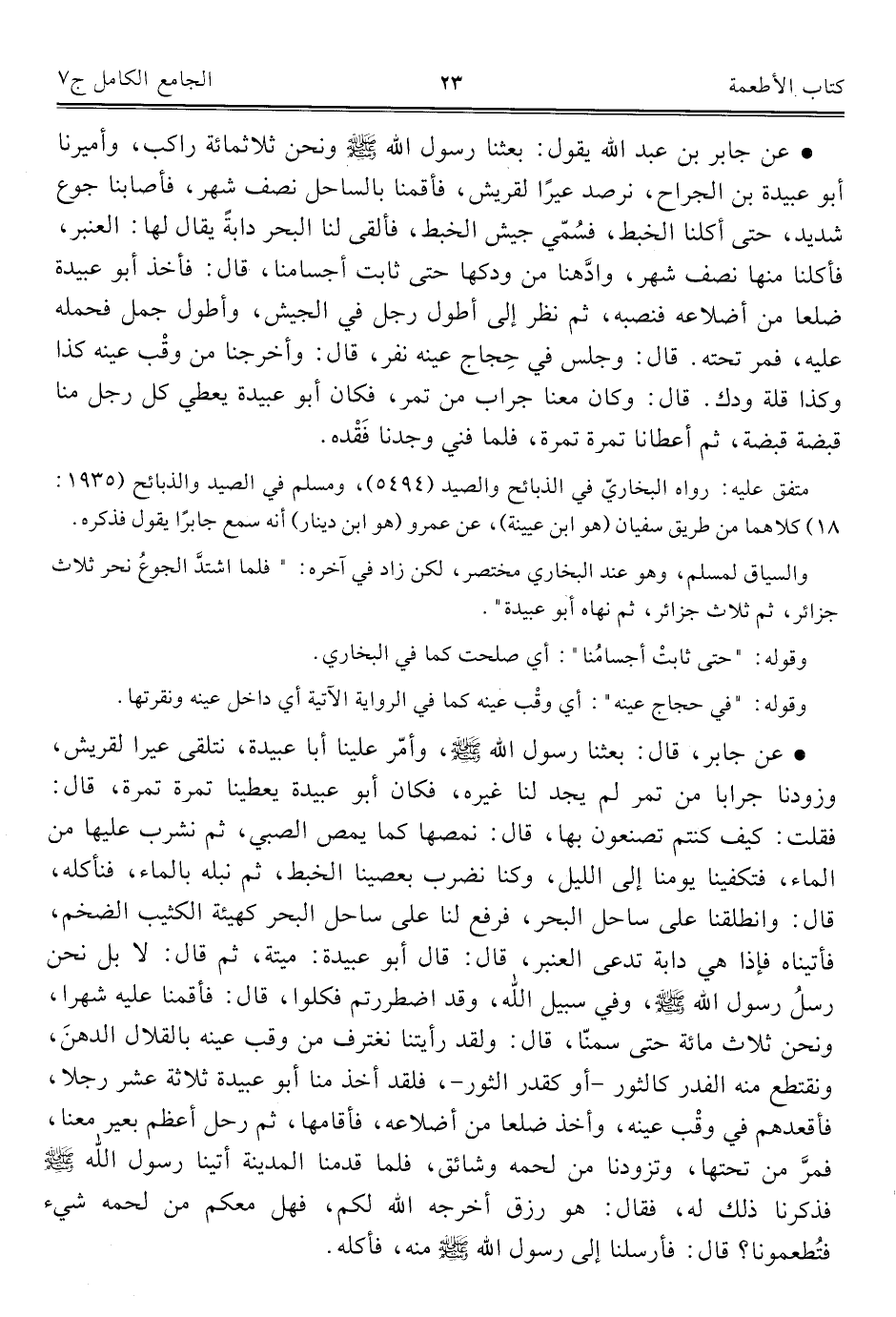 • عن جابر، قال: بعثنا رسول الله - صلى الله عليه وسلم -، وأمّر علينا أبا عبيدة، نتلقى عيرا لقريش، وزودنا جرابا من تمر لم يجد لنا غيره، فكان أبو عبيدة يعطينا تمرة تمرة، قال: فقلت: كيف كنتم تصنعون بها، قال: نمصها كما يمص الصبي، ثم نشرب عليها من الماء، فتكفينا يومنا إلى الليل، وكنا نضرب بعصينا الخبط، ثم نبله بالماء، فنأكله، قال: وانطلقنا على ساحل البحر، فرفع لنا على ساحل البحر كهيئة الكثيب الضخم، فأتيناه فإذا هي دابة تدعى العنبر، قال: قال أبو عبيدة: ميتة، ثم قال: لا بل نحن رسلُ رسول الله - صلى الله عليه وسلم -، وفي سبيل الله، وقد اضطررتم فكلوا، قال: فأقمنا عليه شهرا، ونحن ثلاث مائة حتى سمنّا، قال: ولقد رأيتنا نغترف من وقت عينه بالقلال الدهنَ، وتقتطع منه الفدر كالثور - أو كقدر الثور -، فلقد أخذ منا أبو عبيدة ثلاثة عشر رجلا، فأقعدهم في وقْب عينه، وأخذ ضلعا من أضلاعه، فأقامها، ثم رحل أعظم بعير معنا، فمرَّ من تحتها، وتزودنا من لحمه وشائق، فلما قدمنا المدينة أتينا رسول الله - صلى الله عليه وسلم - فذكرنا ذلك له، فقال: هو رزق أخرجه الله لكم، فهل معكم من لحمه شيء فتُطعمونا؟ قال: فأرسلنا إلى رسول الله - صلى الله عليه وسلم - منه، فأكله.