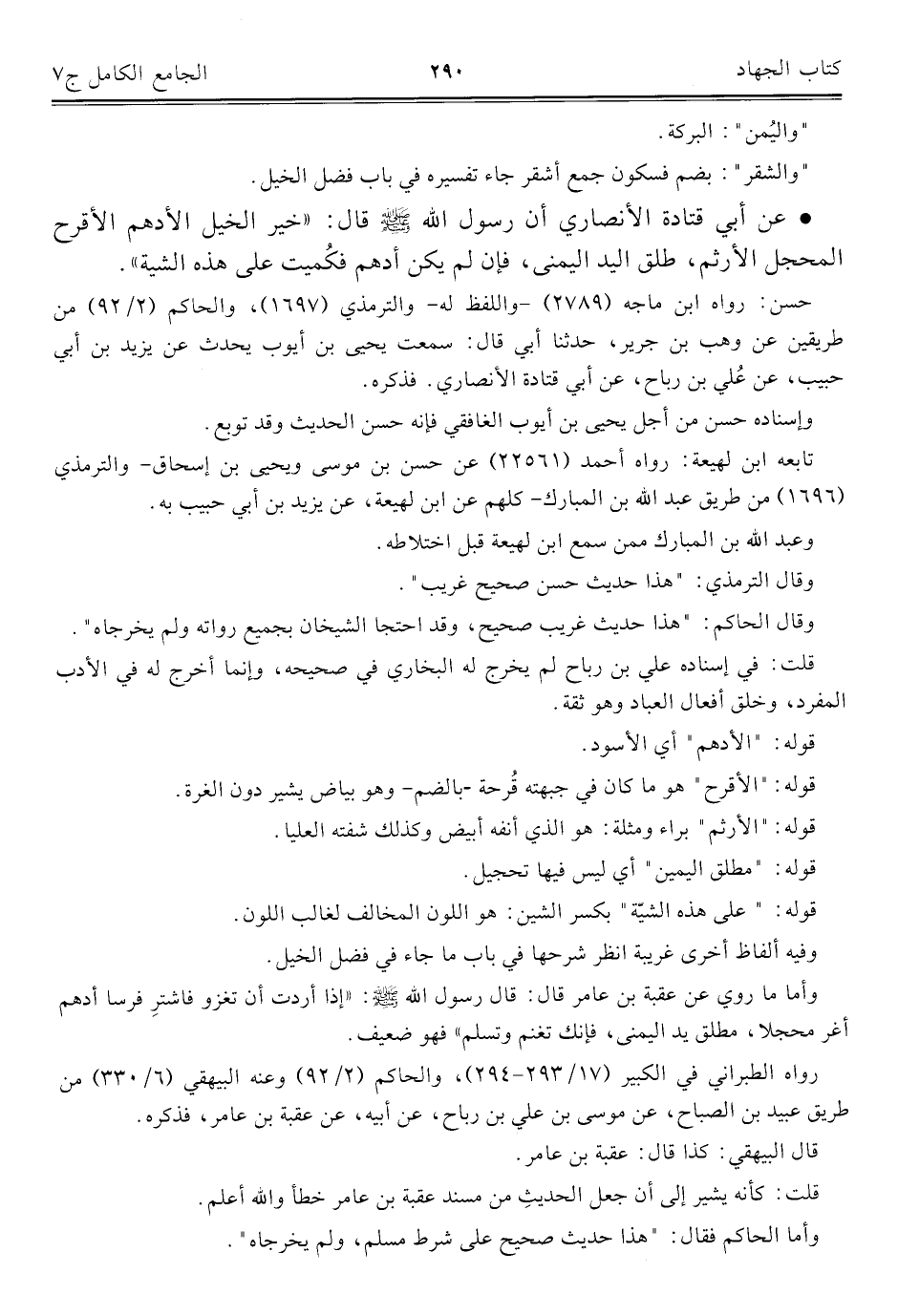 وأمّا ما رُوي عن عقبة بن عامر قال: قال رسول الله - صلى الله عليه وسلم -: "إذا أردت أن تغزو فاشترِ فرسا أدهم أغر محجلا، مطلق يد اليُمنى، فإنك تغنم وتسلم" فهو ضعيف.