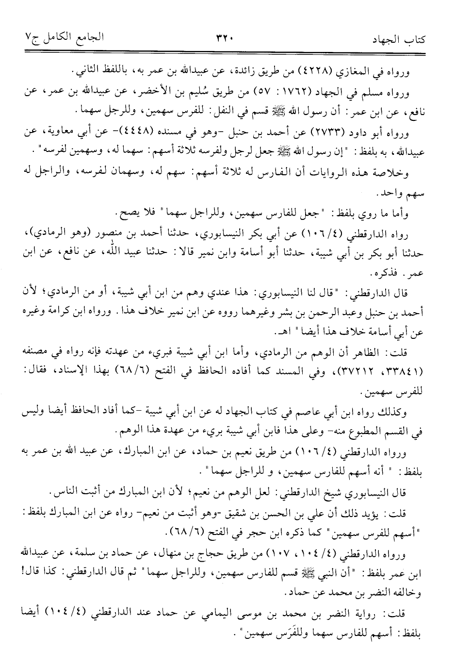 قلت: الظاهر أن الوهم من الرماديّ، وأمّا ابن أبي شيبة فبريء من عهدته فإنه رواه في مصنفه (٣٣٨٤١، ٣٧٢١٢)، وفي المسند كما أفاده الحافظ في الفتح (٦/ ٦٨) بهذا الإسناد، فقال: للفرس سهمين.