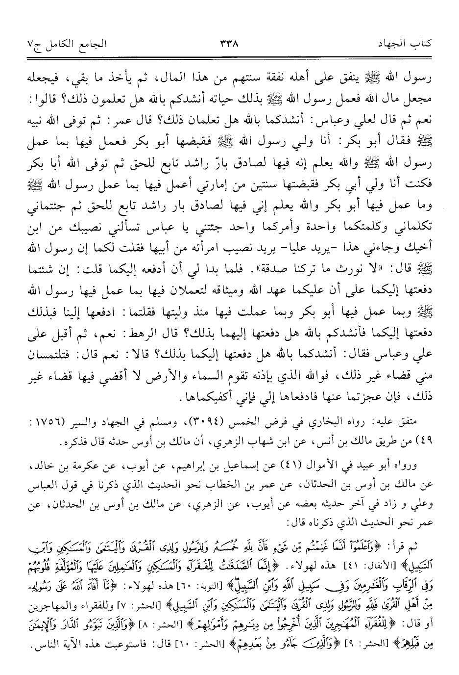 ثمّ قرأ: {وَاعْلَمُوا أَنَّمَا غَنِمْتُمْ مِنْ شَيْءٍ فَأَنَّ لِلَّهِ خُمُسَهُ وَلِلرَّسُولِ وَلِذِي الْقُرْبَى وَالْيَتَامَى وَالْمَسَاكِينِ وَابْنِ السَّبِيلِ} [الأنفال: ٤١]، هذه لهولاء. {إِنَّمَا الصَّدَقَاتُ لِلْفُقَرَاءِ وَالْمَسَاكِينِ وَالْعَامِلِينَ عَلَيْهَا وَالْمُؤَلَّفَةِ قُلُوبُهُمْ وَفِي الرِّقَابِ وَالْغَارِمِينَ وَفِي سَبِيلِ اللَّهِ وَابْنِ السَّبِيلِ} [التوبة: ٦٠]، هذه لهولاء: {مَا أَفَاءَ اللَّهُ عَلَى رَسُولِهِ مِنْ أَهْلِ الْقُرَى فَلِلَّهِ وَلِلرَّسُولِ وَلِذِي الْقُرْبَى وَالْيَتَامَى وَالْمَسَاكِينِ وَابْنِ السَّبِيلِ} [الحشر: ٧] وللفقراء والمهاجرين أو قال: {لِلْفُقَرَاءِ الْمُهَاجِرِينَ الَّذِينَ أُخْرِجُوا مِنْ دِيَارِهِمْ وَأَمْوَالِهِمْ} [الحشر: ٨] {وَالَّذِينَ تَبَوَّءُوا الدَّارَ وَالْإِيمَانَ مِنْ قَبْلِهِمْ} [الحشر: ٩] {وَالَّذِينَ جَاءُوا مِنْ بَعْدِهِمْ} قال: فاستوعبت هذه الآية الناس.