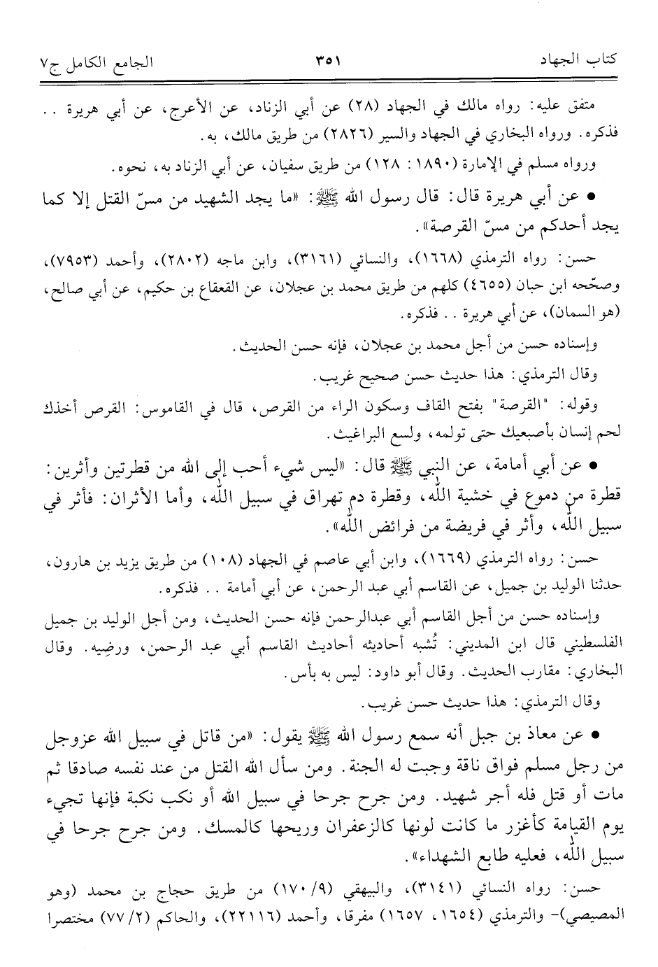 • عن معاذ بن جبل أنه سمع رسول الله - صلى الله عليه وسلم - يقول: "من قاتل في سبيل الله عَزَّ وَجَلَّ من رجل مسلم فواق ناقة وجبتْ له الجنّة. ومن سأل الله القتل من عند نفسه صادقا ثمّ مات أو قتل فله أجر شهيد. ومن جرح جرحا في سبيل الله أو نكب نكبة فإنها تجيء يوم القيامة كأغزر ما كانت لونها كالزعفران وريحها كالمسك. ومن جرح جرحا في سبيل الله، فعليه طابع الشهداء".