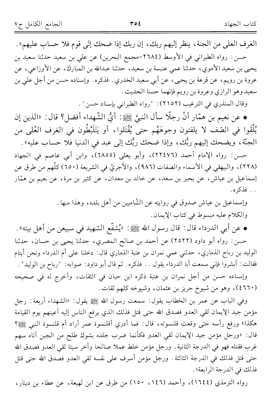 حسن: رواه الإمام أحمد (٢٢٤٧٦)، وأبو يعلى (٦٨٥٥)، وابن أبي عاصم في الجهاد (٢٢٨)، والبيهقي في الأسماء والصفات (٩٨٦)، والآجريّ في الشّريعة (٦٥٠) كلّهم من طرق عن إسماعيل بن عَيَّاش، عن بحير بن سعد، عن خالد بن معدان، عن كثير بن مرة، عن نعيم بن همّار .. فذكره.