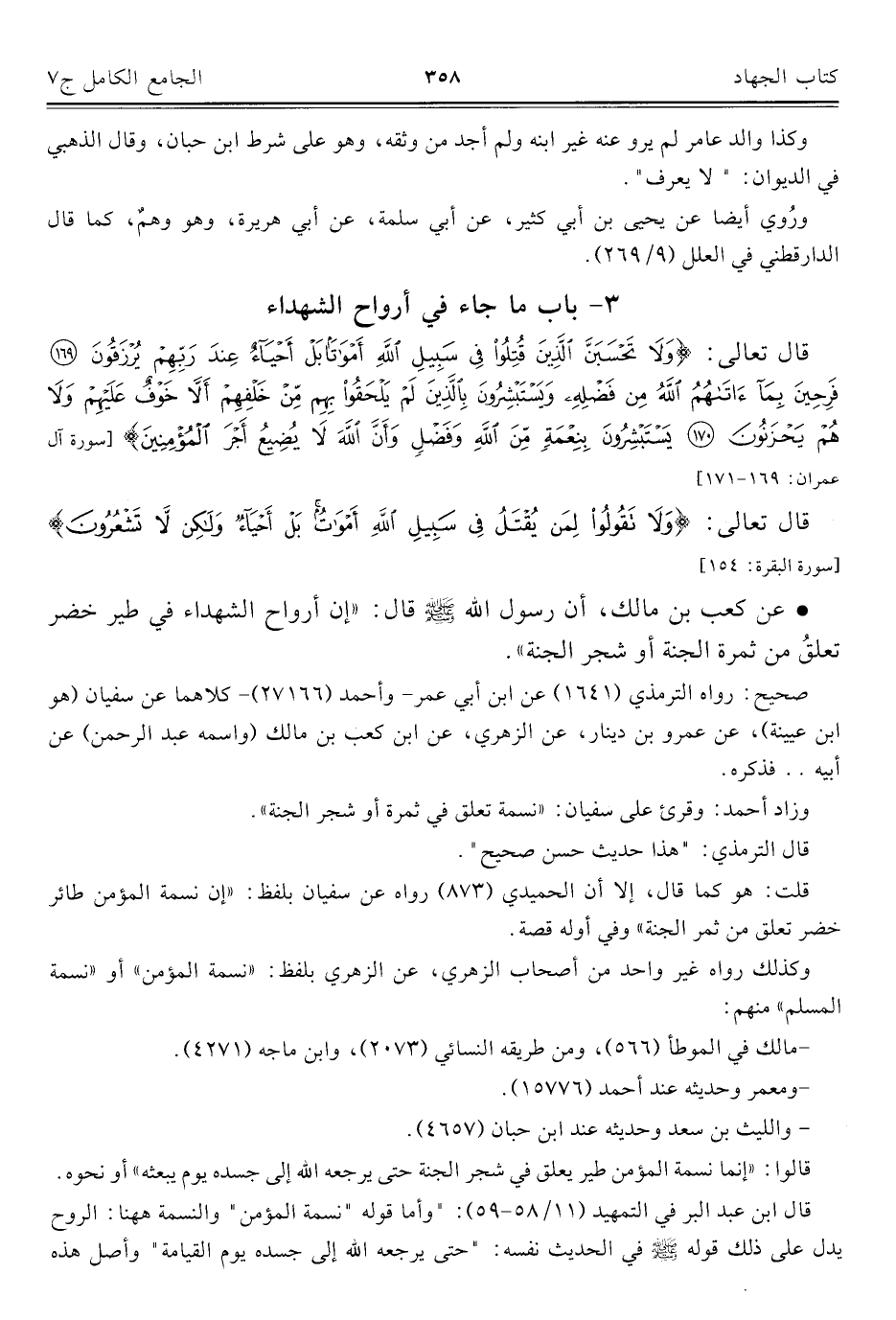 • عن كعب بن مالك، أن رسول الله - صلى الله عليه وسلم - قال: "إنَّ أرواح الشهداء في طير خضر تعلقُ من ثمرة الجنّة أو شجر الجنّة".