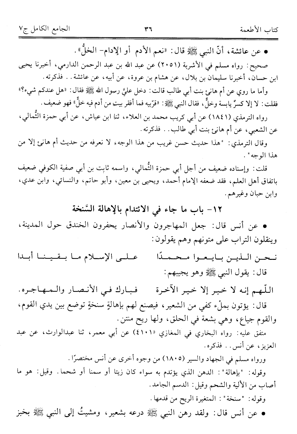وأمّا ما رُوي عن أم هانئ بنت أبي طالب قالت: دخل عليَّ رسول الله صلى الله عليه وسلم فقال: "هل عندكم شيء؟ " فقلت: لا إِلَّا كسرٌ يابسة وخلٌّ، فقال النَّبِيّ - صلى الله عليه وسلم -: "قرّبيه فما أفقر بيت من أدم فيه خلٌّ" فهو ضعيف.