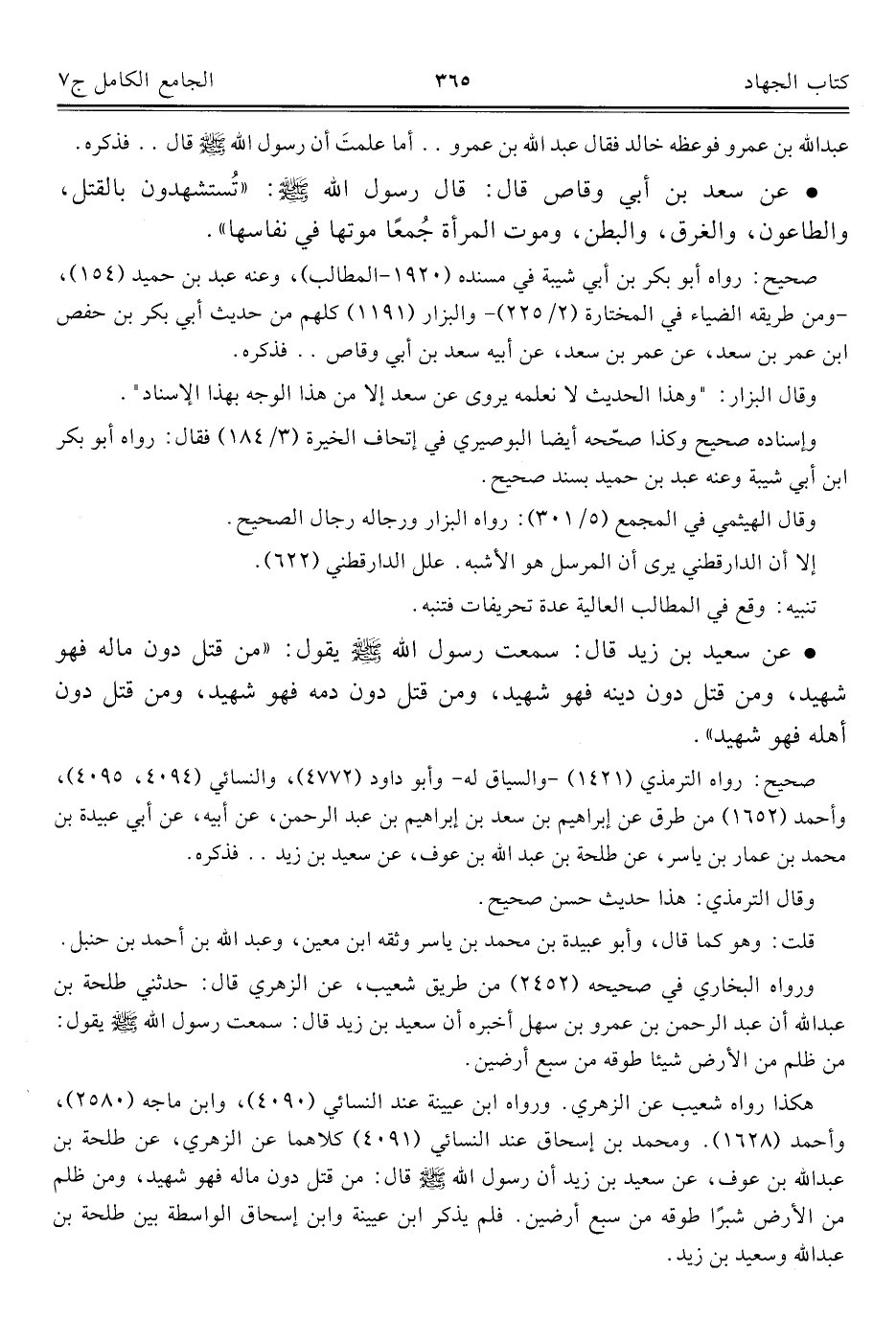 صحيح: رواه الترمذيّ (١٤٢١) - والسياق له - وأبو داود (٤٧٧٢)، والنسائي (٤٠٩٤، ٤٠٩٥)، وأحمد (١٦٥٢) من طرق عن إبراهيم بن سعد بن إبراهيم بن عبد الرحمن، عن أبيه، عن أبي عبيدة بن محمد بن عمار بن ياسر، عن طلحة بن عبد الله بن عوف، عن سعيد بن زيد .. فذكره.