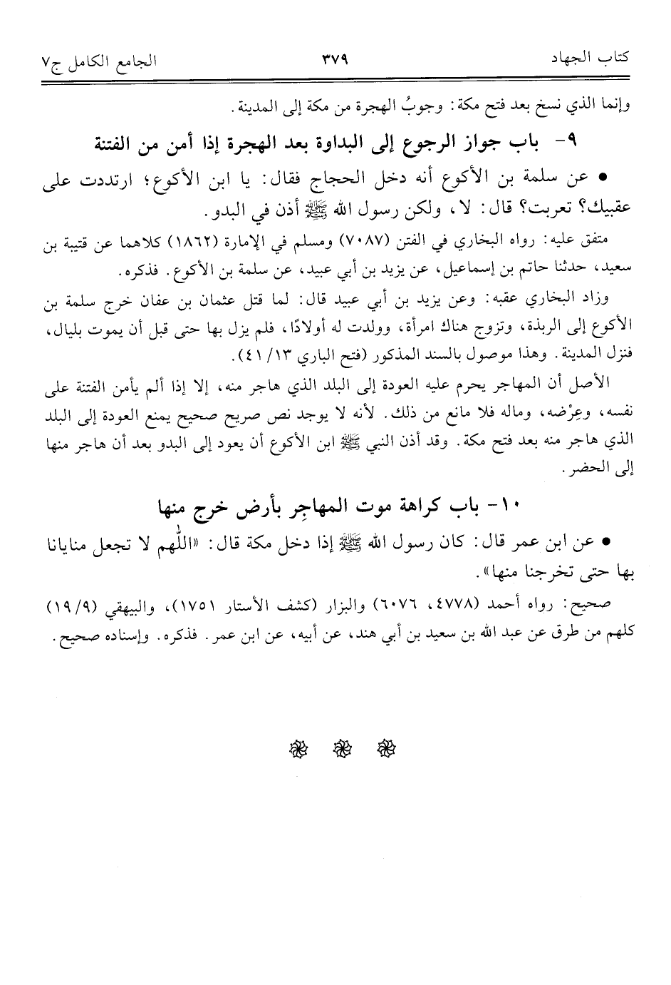كتاب الجامع الكامل في الحديث الصحيح الشامل المرتب على أبواب الفقه (اسم الجزء: 7)