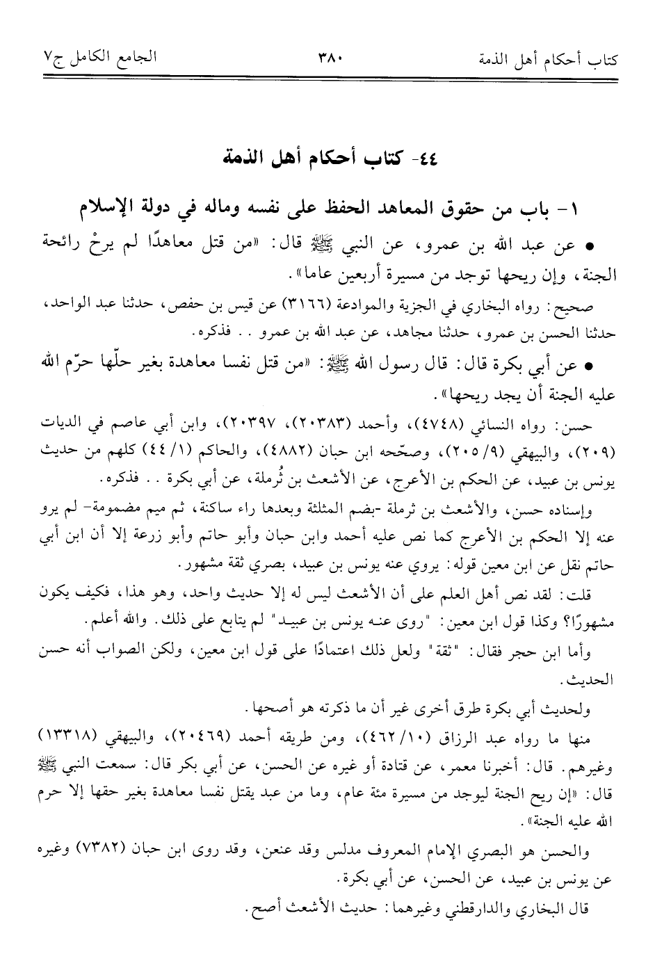 • عن عبد الله بن عمرو، عن النَّبِيّ - صلى الله عليه وسلم - قال: "من قتل معاهدًا لم يرحْ رائحة الجنّة، وإن ريحها توجد من مسيرة أربعين عاما".