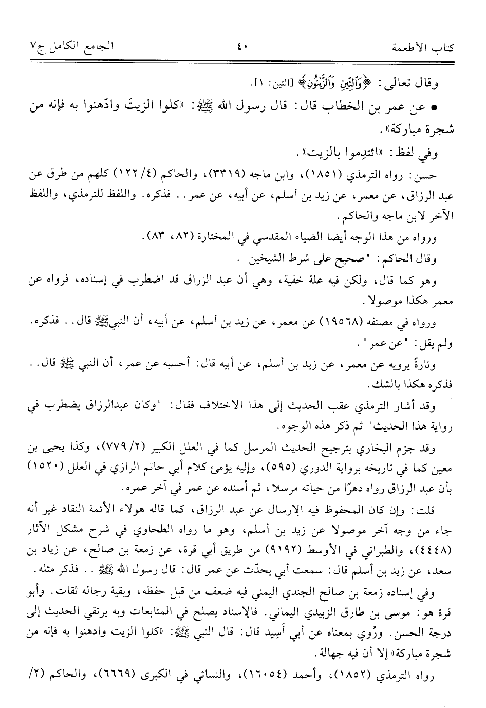 • عن عمر بن الخطّاب قال: قال رسول الله - صلى الله عليه وسلم -: "كلوا الزيتَ وادّهنوا به فإنه من شجرة مباركة".
