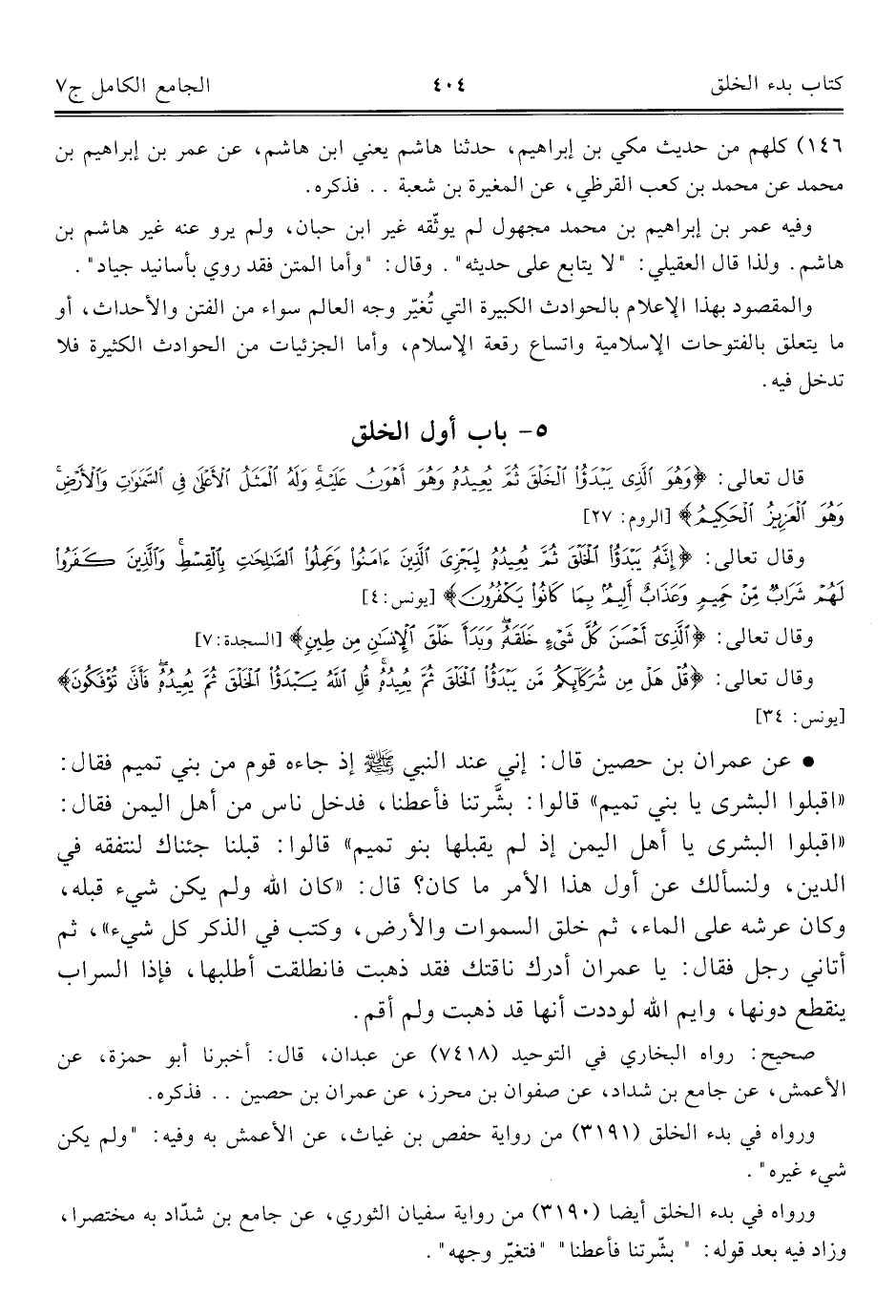 صحيح: رواه البخاري في التوحيد (٧٤١٨) عن عبدان، قال: أخبرنا أبو حمزة، عن الأعمش، عن جامع بن شداد، عن صفوان بن محرز، عن عمران بن حصين .. فذكره.
