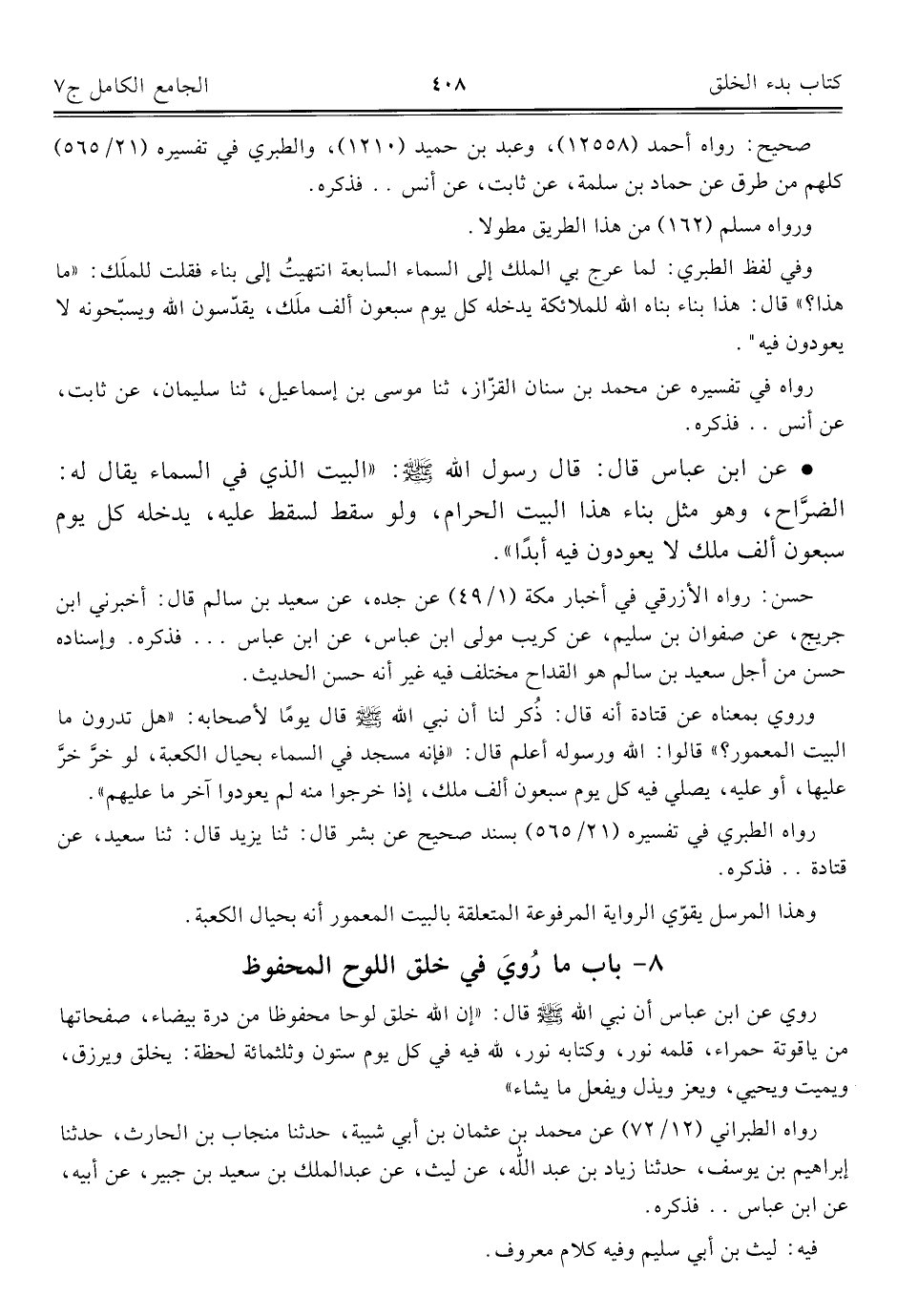 وفي لفظ الطبري: لما عرج بي الملك إلى السماء السابعة انتهيتُ إلى بناء فقلت للملَك: "ما هذا؟ " قال: هذا بناء بناه الله للملائكة يدخله كل يوم سبعون ألف ملَك، يقدّسون الله ويسبّحونه لا يعودون فيه".