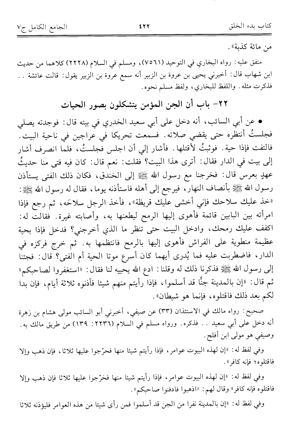 ٢٢ - باب أن الجن المؤمن يتشكلون بصور الحيات