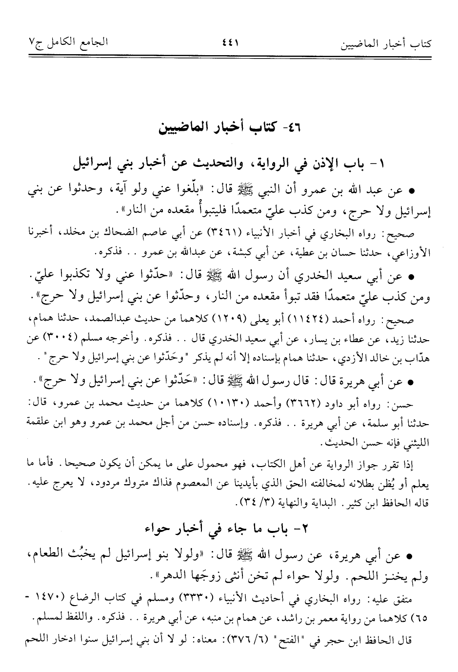 • عن أبي هريرة قال: قال رسول الله - صلى الله عليه وسلم - قال: "حَدّثوا عن بني إسرائيل ولا حرج".