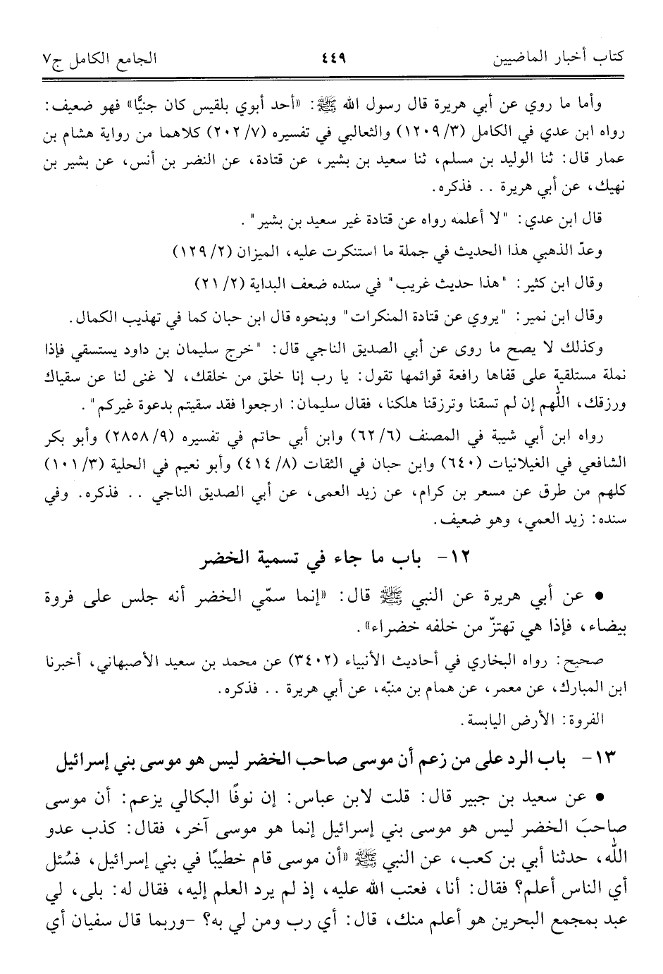• عن أبي هريرة عن النبي - صلى الله عليه وسلم - قال: "إنما سمّي الخضر أنه جلس على فروة بيضاء، فإذا هي تهتزّ من خلفه خضراء".