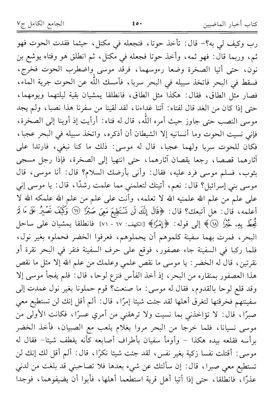 رب وكيف لي به؟ - قال: تأخذ حوتا، فتجعله في مكتل، حيثما فقدت الحوت فهو ثم، وربما قال: فهو ثمه، وأخذ حوتا فجعله في مكتل، ثم انطلق هو وفتاه يوشع بن نون، حتى أتيا الصخرة وضعا رءوسهما، فرقد موسى واضطرب الحوت فخرج، فسقط في البحر فاتخذ سبيله في البحر سربا، فأمسك الله عن الحوت جرية الماء، فصار مثل الطاق، فقال: هكذا مثل الطاق، فانطلقا يمشيان بقية ليلتهما ويومهما، حتى إذا كان من الغد قال لفتاه: آتنا غداءنا، لقد لقينا من سفرنا هذا نصبا، ولم يجد موسى النصب حتى جاوز حيث أمره الله، قال له فتاه: أرأيت إذ أوينا إلى الصخرة، فإني نسيت الحوت وما أنسانيه إلا الشيطان أن أذكره، واتخذ سبيله في البحر عجبا، فكان للحوت سربا ولهما عجبا، قال له موسى: ذلك ما كنا نبغي، فارتدا على آثارهما قصصا، رجعا يقصان آثارهما، حتى انتهيا إلى الصخرة، فإذا رجل مسجى بثوب، فسلم موسى فرد عليه، فقال: وأنى بأرضك السلام؟ قال: أنا موسى، قال موسى بني إسرائيل؟ قال: نعم، أتيتك لتعلمني مما علمت رشدًا، قال: يا موسى إني على علم من علم الله علمنيه الله لا تعلمه، وأنت على علم من علم الله علمكه الله لا أعلمه، قال: هل أتبعك؟ قال: {قَالَ إِنَّكَ لَنْ تَسْتَطِيعَ مَعِيَ صَبْرًا (٦٧) وَكَيْفَ تَصْبِرُ عَلَى مَا لَمْ تُحِطْ بِهِ خُبْرًا} إلى قوله: {إِمْرًا} [الكهف: ٦٧ - ٧١] فانطلقا يمشيان على ساحل البحر، فمرت بهما سفينة كلموهم أن يحملوهم، فعرفوا الخضر فحملوه بغير نول، فلما ركبا في السفينة جاء عصفور، فوقع على حرف السفينة فنقر في البحر نقرة أو نقرتين، قال له الخضر: يا موسى ما نقص علمي وعلمك من علم الله إلا مثل ما نقص هذا العصفور بمنقاره من البحر، إذ أخذ الفأس فنزع لوحا، قال: فلم يفجأ موسى إلا وقد قلع لوحا بالقدوم، فقال له موسى: ما صنعت؟ قوم حملونا بغير نول عمدت إلى سفينتهم فخرقتها لتغرق أهلها لقد جئت شيئا إمرًا، قال: ألم أقل إنك لن تستطيع معي صبرًا، قال: لا تؤاخذني بما نسيت ولا ترهقني من أمري عسرًا، فكانت الأولى من موسى نسيانا، فلما خرجا من البحر مروا بغلام يلعب مع الصبيان، فأخذ الخضر برأسه فقلعه بيده هكذا - وأومأ سفيان بأطراف أصابعه كأنه يقطف شيئا - فقال له موسى: أقتلت نفسا زكية بغير نفس، لقد جئت شيئا نكرًا، قال: ألم أقل لك إنك لن تستطيع معي صبرا، قال: إن سألتك عن شيء بعدها فلا تصاحبني قد بلغت من لدني عذرًا، فانطلقا، حتى إذا أتيا أهل قرية استطعما أهلها، فأبوا أن يضيفوهما، فوجدا