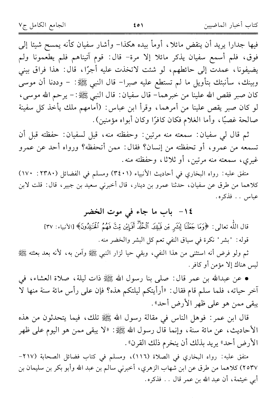 فيها جدارا يريد أن ينقض مائلا، أومأ بيده هكذا - وأشار سفيان كأنه يمسح شيئا إلى فوق، فلم أسمع سفيان يذكر مائلا إلا مرة - قال: قوم آتيناهم فلم يطعمونا ولم يضيفونا، عمدت إلى حائطهم، لو شئت لاتخذت عليه أجرًا، قال: هذا فراق بيني وبينك، سأنبئك بتأويل ما لم تستطع عليه صبرا - قال النبي - صلى الله عليه وسلم -: - وددنا أن موسى كان صبر فقص الله علينا من خبرهما - قال سفيان: قال النبي - صلى الله عليه وسلم -: - يرحم الله موسى، لو كان صبر يقص علينا من أمرهما، وقرأ ابن عباس: (أمامهم ملك يأخذ كل سفينة صالحة غصبًا، وأما الغلام فكان كافرًا وكان أبواه مؤمنين).