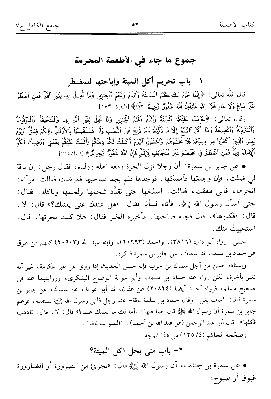 وإسناده حسن من أجل سماك بن حرب فإنه حسن الحديث إذا روى عن غير عكرمة، غير أنه تغير بأخرة، لكن رواه عنه حمّاد بن سلمة، وأبو عوانة الوضاح اليشكريّ، وروايتهما عنه في صحيح مسلم، فرواه أحمد أيضًا (٢٠٨٢٤) عن عفّان، ثنا أبو عوانة، عن سماك، عن جابر بن سمرة قال: "مات بغل - وقال حمّاد بن سلمة ناقة - عند رجل فأتى رسول الله - صلى الله عليه وسلم - يستفتيه، فزعم جابر بن سمرة أن رسول الله صلى الله عليه وسلم قال لصاحبها: "أما لك ما يغنيك عنها؟ " قال: لا، قال: "اذهب فكلها". قال أبو عبد الرحمن (هو عبد الله بن أحمد): "الصواب ناقة".