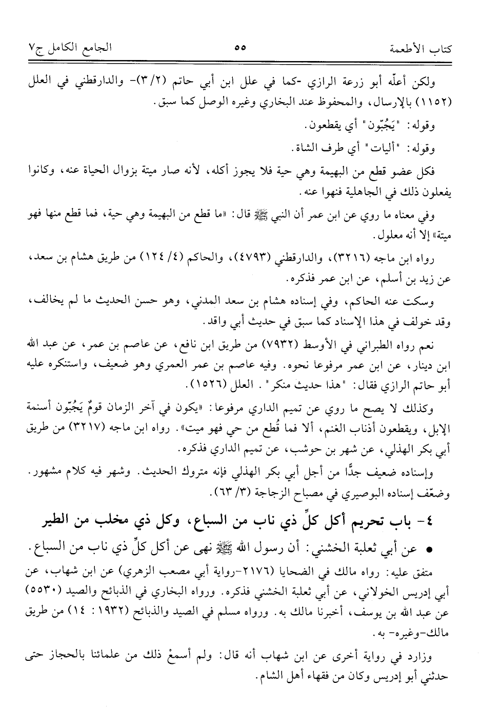 وفي معناه ما رُوي عن ابن عمر أن النَّبِيّ صلى الله عليه وسلم قال: "ما قطع من البهيمة وهي حية، فما قطع منها فهو ميتة، إِلَّا أنه معلول.