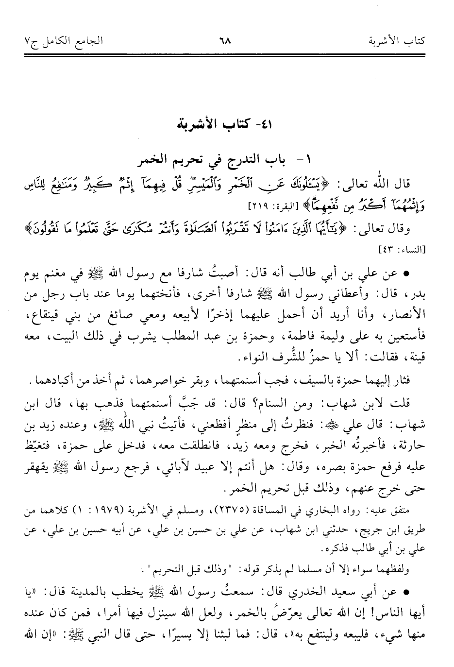 قلت لابن شهاب: ومن السنام؟ قال: قد جَبَّ أسنمتهما فذهب بها، قال ابن شهاب: قال علي - رضي الله عنه -: فنظرتُ إلى منظرٍ أفظعني، فأتيتُ نبي الله - صلى الله عليه وسلم -، وعنده زيد بن حارثة، فأخبرتُه الخبر، فخرج ومعه زيد، فانطلقت معه، فدخل على حمزة، فتغيّظ عليه فرفع حمزة بصره، وقال: هل أنتم إلا عبيد لآبائي، فرجع رسول الله - صلى الله عليه وسلم - يقهقر حتى خرج عنهم، وذلك قبل تحريم الخمر.