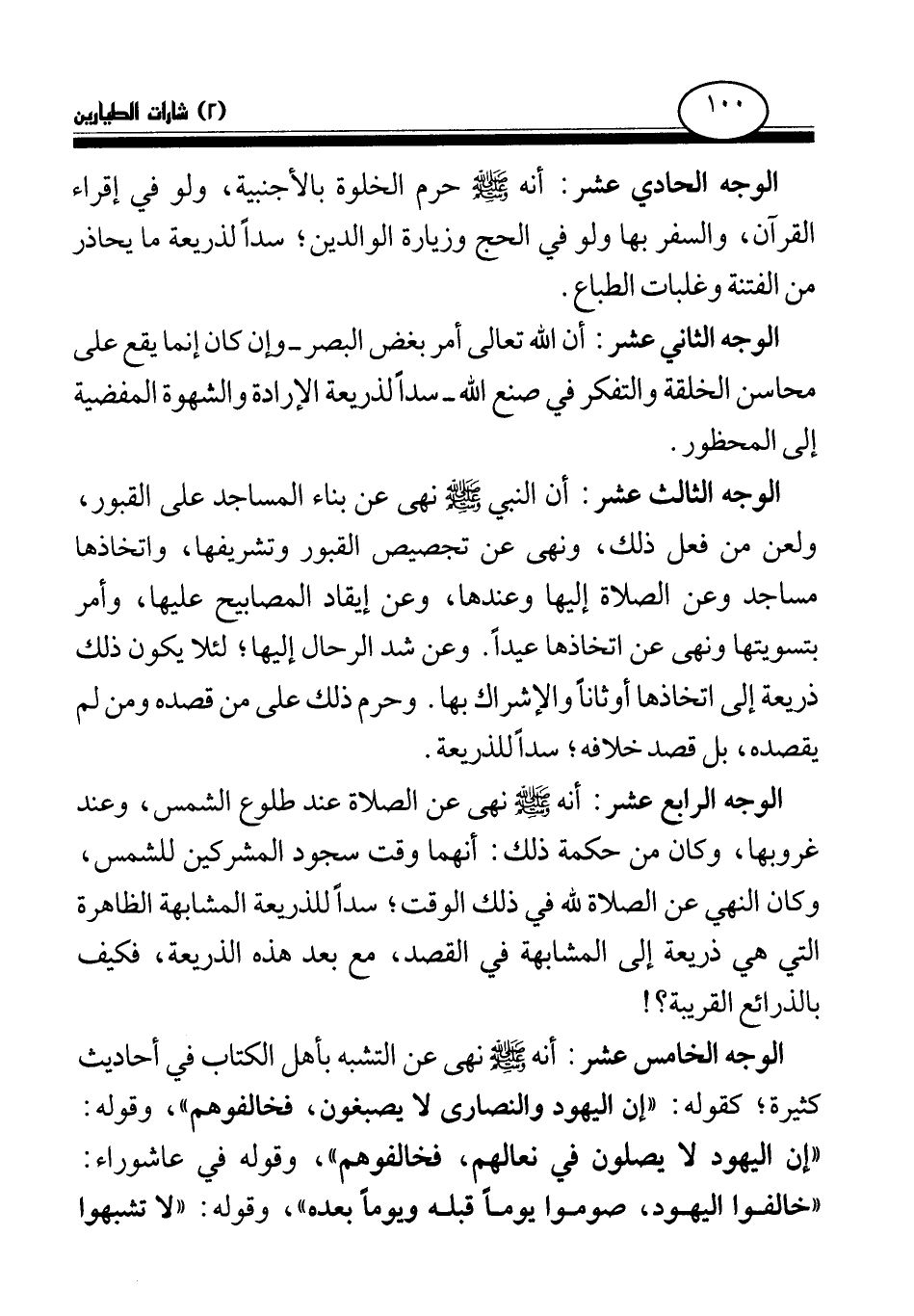 الوجه الرابع عشر: أنه صلى الله عليه وسلم نهى عن الصلاة عند طلوع الشمس، وعند غروبها، وكان من حكمة ذلك: أنهما وقت سجود المشركين للشمس، وكان النهي عن الصلاة لله في ذلك الوقت؛ سدا للذريعة المشابهة الظاهرة التي هي ذريعة إلى المشابهة في القصد، مح بعد هذه الذريعة، فكيف بالذرائع القريبة؟!