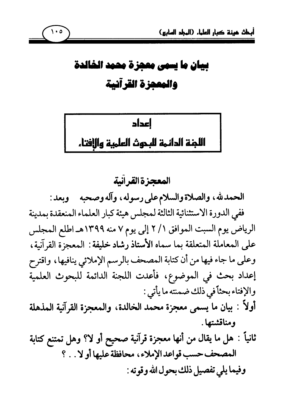 ففي الدورة الاستثنائية الثالثة لمجلس هيئة كبار العلماء المنعقدة بمدينة الرياض يوم السبت الموافق 1\ 2 إلى يوم 7 منه 1399 هـ اطلع المجلس على المعاملة المتعلقة بما سماه الأستاذ رشاد خليفة: المعجزة القرآنية، وعلى ما جاء فيها من أن كتابة المصحف بالرسم الإملائي ينافيها، واقترح إعداد بحث في الموضوع، فأعدت اللجنة الدائمة للبحوث العلمية والإفتاء بحثا في ذلك ضمنته ما يأتي: