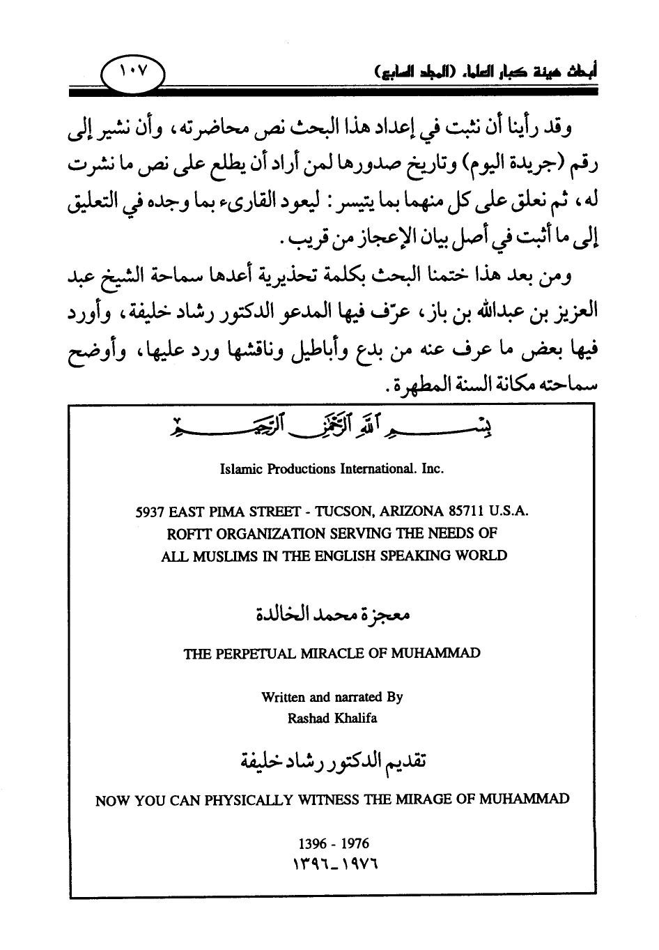ومن بعد هذا ختمنا البحث بكلمة تحذيرية أعدها سماحة الشيخ عبد العزيز بن عبد الله بن باز، عرف فيها المدعو الدكتور رشاد خليفة، وأورد بعض ما عرف عنه من بدع وأباطيل وناقشها ورد عليها، وأوضح سماحته مكانة السنة المطهرة.