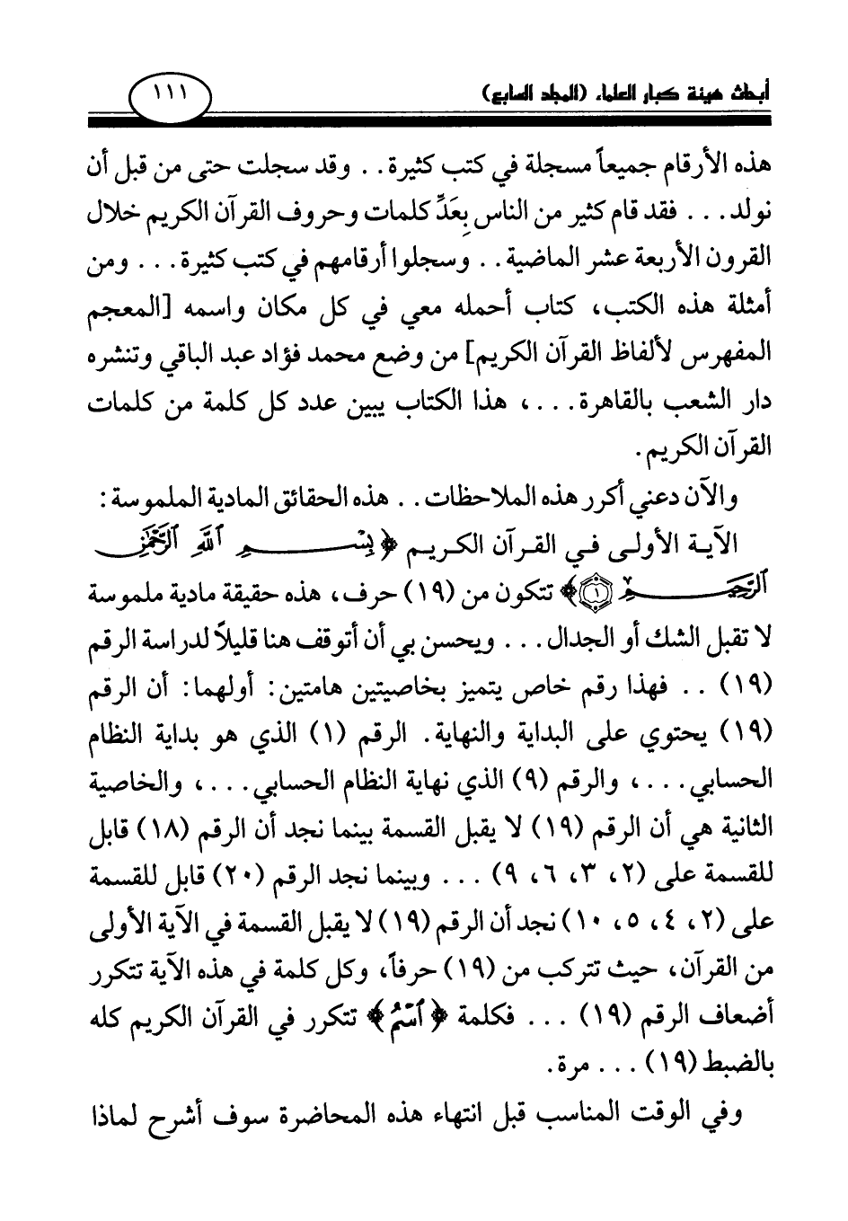 الآية الأولى في القرآن الكريم {بِسْمِ اللَّهِ الرَّحْمَنِ الرَّحِيمِ} (¬1) تتكون من (19) حرف، هذه حقيقة مادية ملموسة لا تقبل الشك أو الجدال ... ويحسن بي أن أتوقف هنا قليلا لدراسة الرقم (19) .. فهذا رقم خاص يتميز بخاصيتين هامتين: أولهما: أن الرقم (19) يحتوي على البداية والنهاية. الرقم (1) الذي هو بداية النظام الحسابي ... ، والرقم (9) الذي نهاية النظام الحسابي ... ، والخاصية الثانية هي أن الرقم (19) لا يقبل القسمة بينما نجد أن الرقم (18) قابل للقسمة على (2، 3، 6، 9) ... وبينما نجد الرقم (20) قابل للقسمة على (2، 4، 5، 10) نجد أن الرقم (19) لا يقبل القسمة في الآية الأولى من القرآن، حيث تتركب من (19) حرفا، وكل كلمة في هذه الآية تتكرر أضعاف الرقم (19) ... فكلمة اسم تتكرر في القرآن الكريم كله بالضبط (19) ... مرة.
