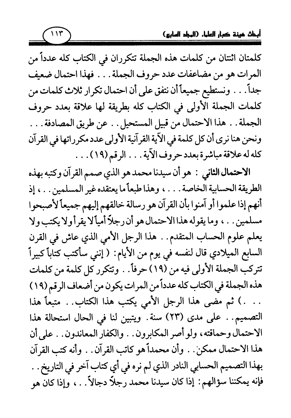 كلمتان اثنتان من كلمات هذه الجملة تتكرران في الكتاب كله عددا من المرات هو من مضاعفات عدد حروف الجملة ... فهذا احتمال ضعيف جدا ... ونستطيع جميعا أن نتفق على أن احتمال تكرار ثلاث كلمات من كلمات الجملة الأولى في الكتاب كله بطريقة لها علاقة بعدد حروف الجملة.. هذا الاحتمال من قبيل المستحيل.. عن طريق المصادفة ... ونحن هنا نرى أن كل كلمة في الآية القرآنية الأولى عدد مكرراتها في القرآن كله له علاقة مباشرة بعدد حروف الآية ... الرقم (19) ...