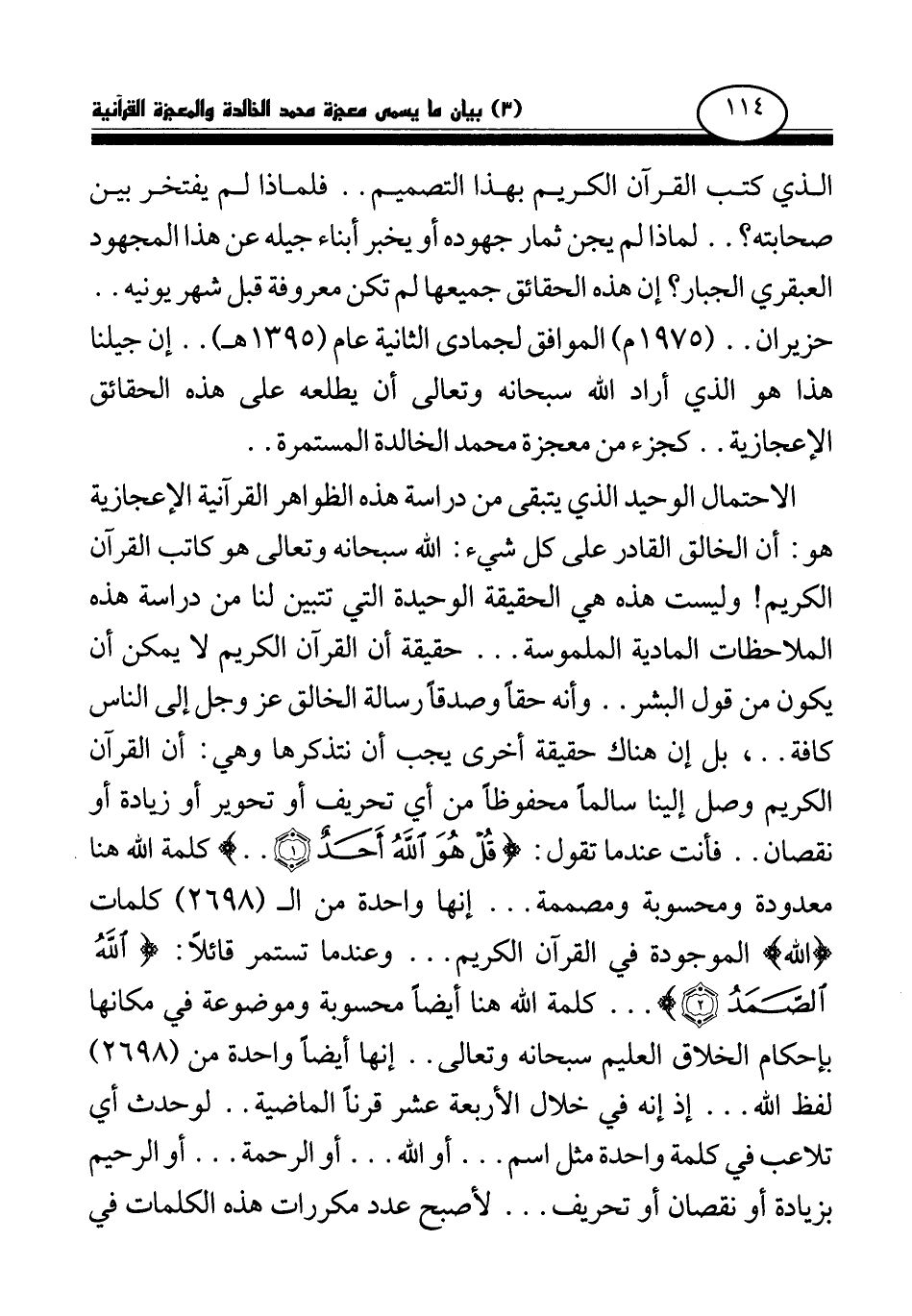 الاحتمال الوحيد الذي يتبقى من دراسة هذه الظواهر القرآنية الإعجازية هو: أن الخالق القادر على كل شيء: الله سبحانه وتعالى هو كاتب القرآن الكريم، وليست هذه هي الحقيقة الوحيدة التي تتبين لنا من دراسة هذه الملاحظات المادية الملموسة ... حقيقة أن القرآن الكريم لا يمكن أن يكون من قول البشر.. وأنه حقا وصدقا رسالة الخالق عز وجل إلى الناس كافة..، بل إن هناك حقيقة أخرى يجب أن نتذكرها وهي: أن القرآن الكريم وصل إلينا سالما محفوظا من أي تحريف أو تحوير أو زيادة أو نقصان.. فأنت عندما تقول: {قُلْ هُوَ اللَّهُ أَحَدٌ} (¬1) كلمة الله هنا معدودة ومحسوبة ومصممة ... إنها واحدة من الـ (2698) كلمات الله الموجودة في القرآن الكريم ... وعندما تستمر قائلا: {اللَّهُ الصَّمَدُ} (¬2) كلمة الله هنا أيضا محسوبة وموضوعة في مكانها بإحكام الخلاق العليم سبحانه وتعالى.. إنها أيضا واحدة من (2698) لفظ الله ... إذ إنه في خلال الأربعة عشر قرنا الماضية.. لو حدث أي تلاعب في كلمة واحدة مثل اسم ... أو الله ... أو الرحمة ... أو الرحيم بزيادة أو نقصان أو تحريف ... لأصبح عدد مكررات هذه الكلمات في