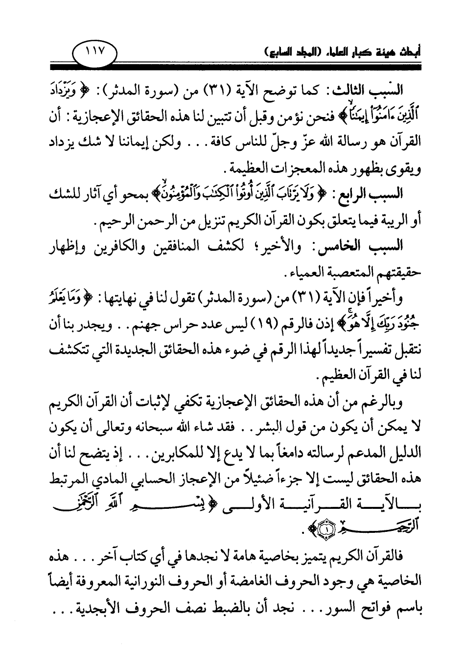 وبالرغم من أن هذه الحقائق الإعجازية تكفي لإثبات أن القرآن الكريم لا يمكن أن يكون من قول البشر.. فقد شاء الله سبحانه وتعالى أن يكون الدليل المدعم لرسالته دامغا بما لا يدع إلا للمكابرين ... إذ يتضح لنا أن هذه الحقائق ليست إلا جزءا ضئيلا من الإعجاز الحسابي المادي المرتبط بالآية القرآنية الأولى {بِسْمِ اللَّهِ الرَّحْمَنِ الرَّحِيمِ} (¬1)