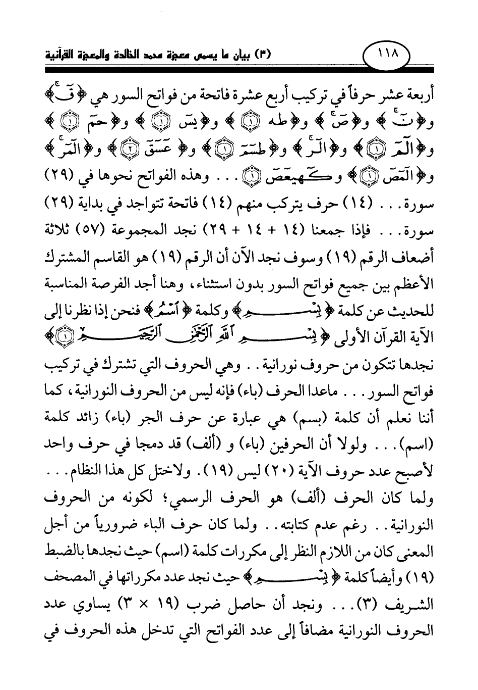 ولما كان الحرف (ألف) هو الحرف الرسمي؛ لكونه من الحروف النورانية.. رغم عدم كتابته.. ولما كان حرف الباء ضروريا من أجل المعنى كان من اللازم النظر إلى مكررات كلمة (اسم) حيث نجدها بالضبط (19) وأيضا كلمة بسم حيث نجد عدد مكرراتها في المصحف الشريف (3) ... ونجد أن حاصل ضرب (19 × 3) يساوي عدد الحروف النورانية مضافا إلى عدد الفواتح التي تدخل هذه الحروف في