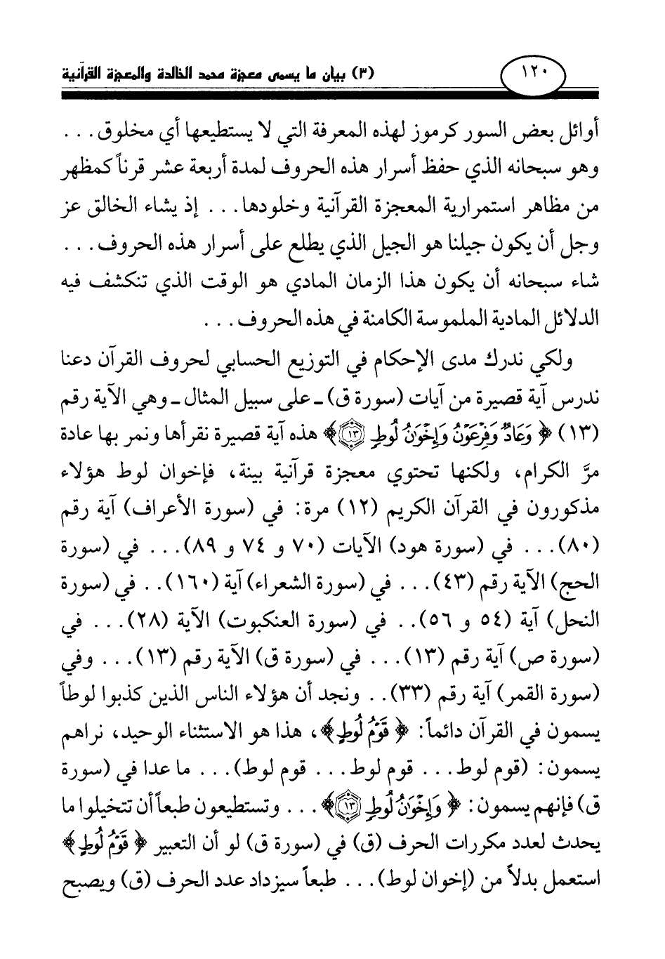ولكي ندرك مدى الإحكام في التوزيع الحسابي لحروف القرآن دعنا ندرس آية قصيرة من آيات (سورة ق) -على سبيل المثال- وهي الآية رقم (13) {وَعَادٌ وَفِرْعَوْنُ وَإِخْوَانُ لُوطٍ} (¬1) هذه آية قصيرة نقرأها ونمر بها عادة مر الكرام، ولكنها تحتوي معجزة قرآنية بينة، فإخوان لوط هؤلاء مذكورون في القرآن الكريم (12) مرة: في (سورة الأعراف) آية رقم (80) ... في (سورة هود) الآيات (70 و 74 و 89) ... في (سورة الحج) الآية رقم (43) ... في (سورة الشعراء) آية (160) .. في (سورة النحل) آية (54 و 56) .. في (سورة العنكبوت) الآية (28) ... في (سورة ص) آية رقم (13) ... في (سورة ق) الآية رقم (13) ... وفي (سورة القمر) آية رقم (33) .. ونجد أن هؤلاء الناس الذين كذبوا لوطا يسمون في القرآن دائما: قوم لوط، هذا هو الاستثناء الوحيد، نراهم يسمون: (قوم لوط ... قوم لوط ... قوم لوط) ... ما عدا في (سورة ق) فإنهم يسمون: {وَإِخْوَانُ لُوطٍ} (¬2) وتستيطعون طبعا أن تتخيلوا ما يحدث لعدد مكررات الحرف (ق) في (سورة ق) لو أن التعبير قوم لوط استعمل بدلا من (إخوان لوط) ... طبعا سيزداد عدد الحرف (ق) ويصبح