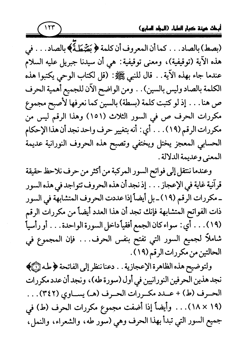 (بصط) بالصاد ... كما أن المعروف أن كلمة بصطة بالصاد ... في هذه الآية (توقيفية) ، ومعنى توقيفية: هي أن سيدنا جبريل عليه السلام عندما جاء بهذه الآية.. قال للنبي صلى الله عليه وسلم: (قل لكتاب الوحي يكتبوا هذه الكلمة بالصاد وليس بالسين) .. ومن الواضح الآن للجميع أهمية الحرف ص هنا ... إذ لو كتبت كلمة (بسطة) بالسين كما نعرفها لأصبح مجموع مكررات الحرف ص في السور الثلاث (151) وهذا الرقم ليس من مكررات الرقم (19) ... أي: أنه بتغيير حرف واحد نجد أن هذا الإحكام الحسابي المعجز يختل ويختفي وتصبح هذه الحروف النورانية عديمة المعنى وعديمة الدلالة.