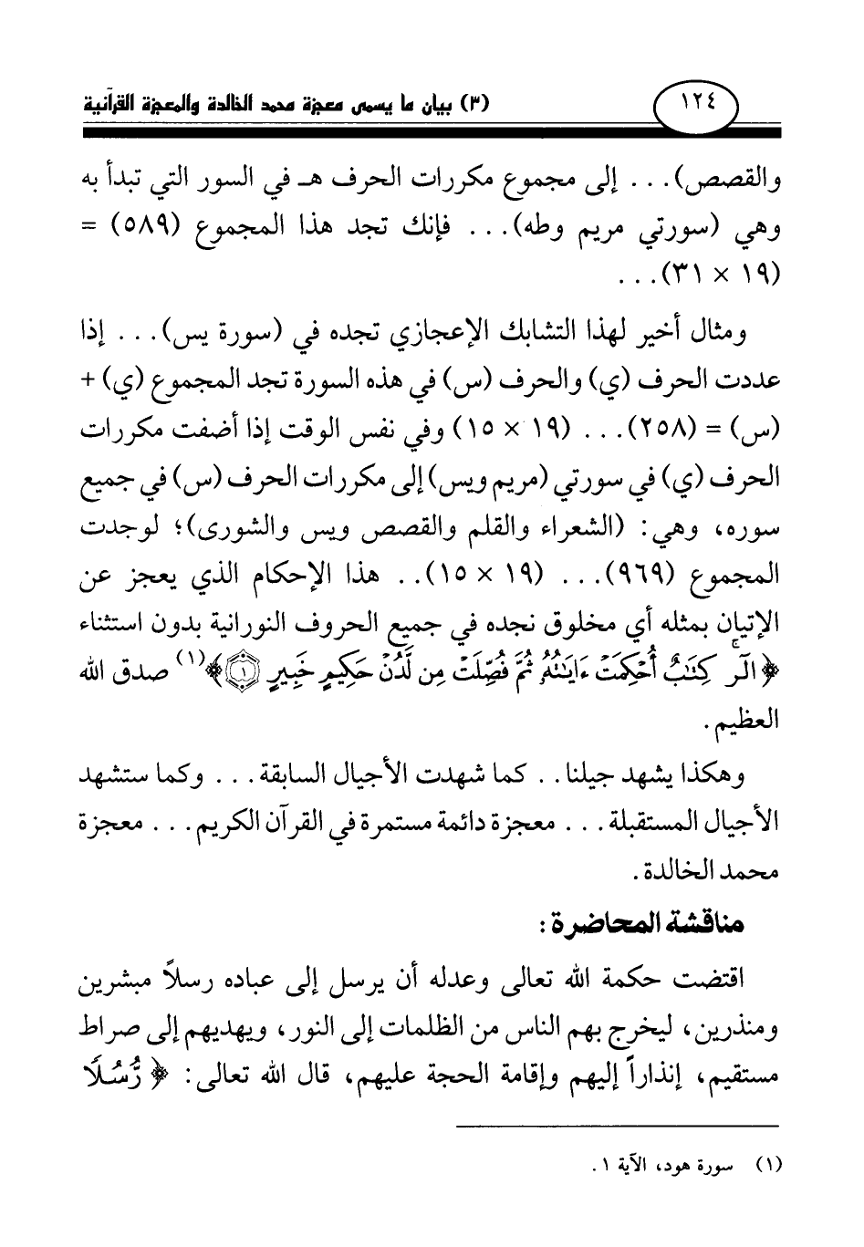 ومثال أخير لهذا التشابك الإعجازي تجده في (سورة يس) ... إذا عددت الحرف (ي) والحرف (س) في هذه السورة تجد المجموع (ي) + (س) = (258) 00. (19 × 15) وفي نفس الوقت إذا أضفت مكررات الحرف (ي) في سورتي (مريم ويس) إلى مكررات الحرف (س) في جميع سوره، وهي: (الشعراء والقلم والقصص ويس والشورى) ؛ لوجدت المجموع (969) 00. (19× 15) .. هذا الإحكام الذي يعجز عن الإتيان بمثله أي مخلوق نجده في جميع الحروف النورانية بدون استثناء {الر كِتَابٌ أُحْكِمَتْ آيَاتُهُ ثُمَّ فُصِّلَتْ مِنْ لَدُنْ حَكِيمٍ خَبِيرٍ} (¬1) صدق الله العظيم.