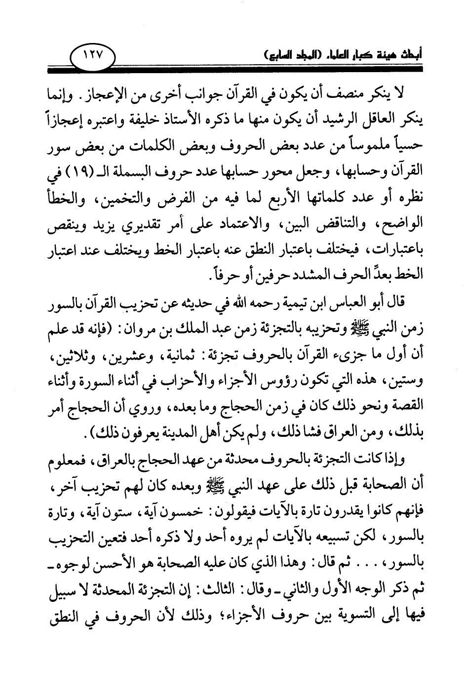 وإذا كانت التجزئة بالحروف محدثة من عهد الحجاج بالعراق، فمعلوم أن الصحابة قبل ذلك على عهد النبي صلى الله عليه وسلم وبعده كان لهم تحزيب آخر، فإنهم كانوا يقدرون تارة بالآيات فيقولون: خمسون آية، ستون آية، وتارة بالسور، لكن تسبيعه بالآيات لم يروه أحد ولا ذكره أحد فتعين التحزيب بالسور، ... ثم قال: وهذا الذي كان عليه الصحابة هو الأحسن لوجوه -ثم ذكر الوجه الأول والثاني- وقال: الثالث: إن التجزئة المحدثة لا سبيل فيها إلى التسوية بين حروف الأجزاء؛ وذلك لأن الحروف في النطق