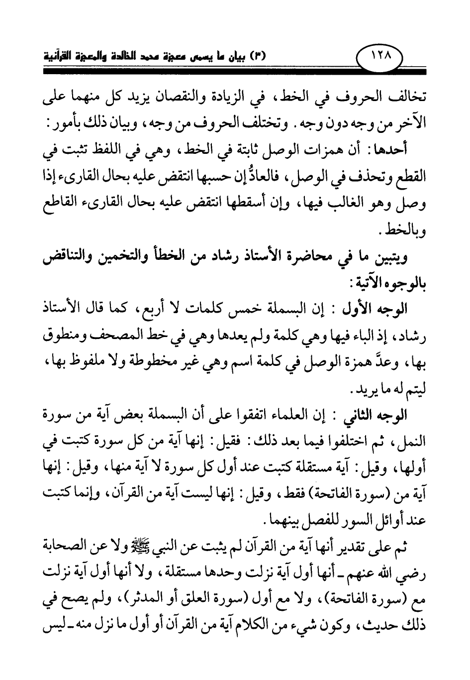 الوجه الأول: إن البسملة خمس كلمات لا أربع، كما قال الأستاذ رشاد، إذ الباء فيها وهي كلمة ولم يعدها وهي في خط المصحف ومنطوق بها، وعد همزة الوصل في كلمة اسم وهي غير مخطوطة ولا ملفوظ بها، ليتم له ما يريد.