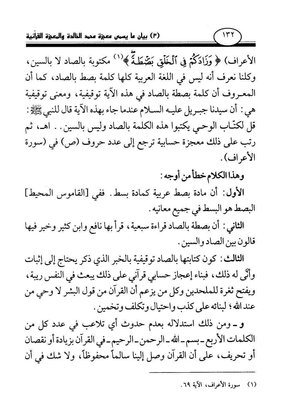 الأعراف) وزادكم في الخلق بصطة مكتوبة بالصاد لا بالسين، وكلنا نعرف أنه ليس في اللغة العربية كلها كلمة بصط بالصاد، كما أن المعروف أن كلمة بصطة بالصاد في هذه الآية توقيفية، ومعنى توقيفية هي: أن سيدنا جبريل عليه السلام عندما جاء بهذه الآية قال للنبي صلى الله عليه وسلم: قل لكتاب الوحي يكتبوا هذه الكلمة بالصاد وليس بالسين. . اهـ