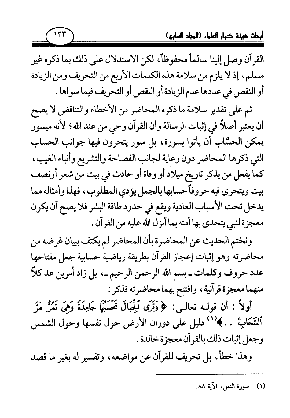 أولا: أن قوله تعالى: {وَتَرَى الْجِبَالَ تَحْسَبُهَا جَامِدَةً وَهِيَ تَمُرُّ مَرَّ السَّحَابِ} (¬1) ... دليل على دوران الأرض حول نفسها وحول الشمس وجعل إثبات ذلك بالقرآن معجزة خالدة.