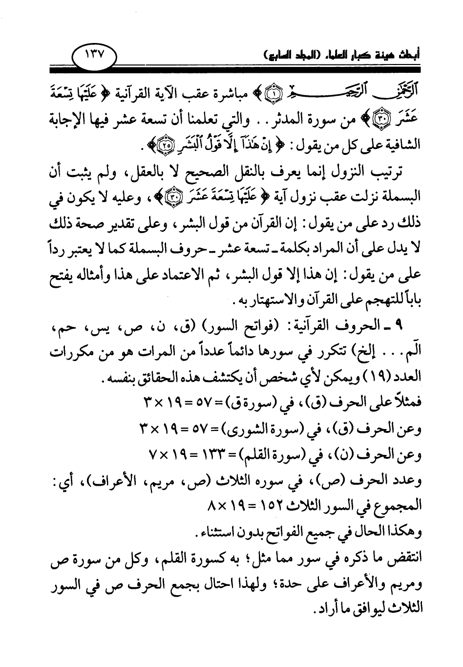 ترتيب النزول إنما يعرف بالنقل الصحيح لا بالعقل، ولم يثبت أن البسملة نزلت عقب نزول آية {عَلَيْهَا تِسْعَةَ عَشَرَ} (¬3) وعليه لا يكون في ذلك رد على من يقول: إن القرآن من قول البشر، وعلى تقدير صحة ذلك لا يدل على أن المراد بكلمة -تسعة عشر- حروف البسملة كما لا يعتبر ردا على من يقول: إن هذا إلا قول البشر، ثم الاعتماد على هذا وأمثاله يفتح بابا للتهجم على القرآن والاستهتار به.