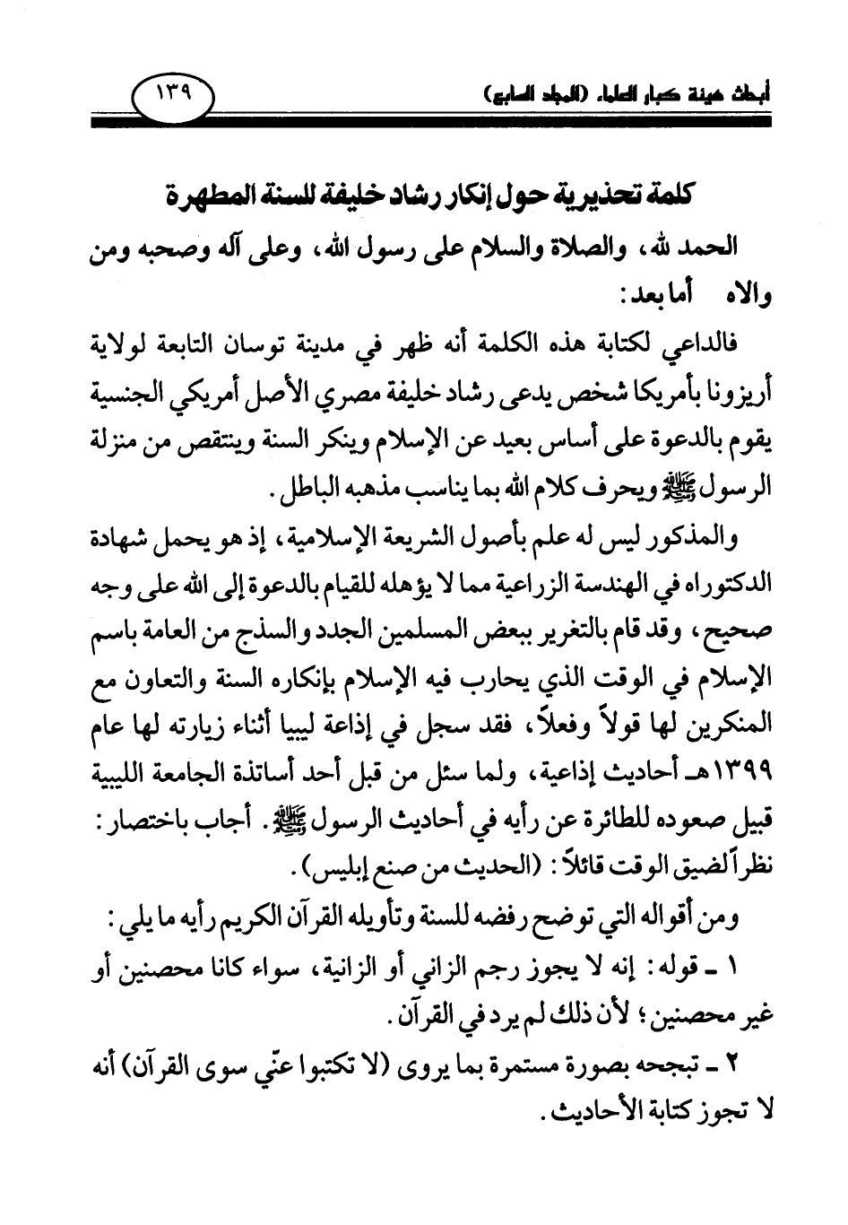 كلمة تحذيرية حول إنكار رشاد خليفة للسنة المطهرة