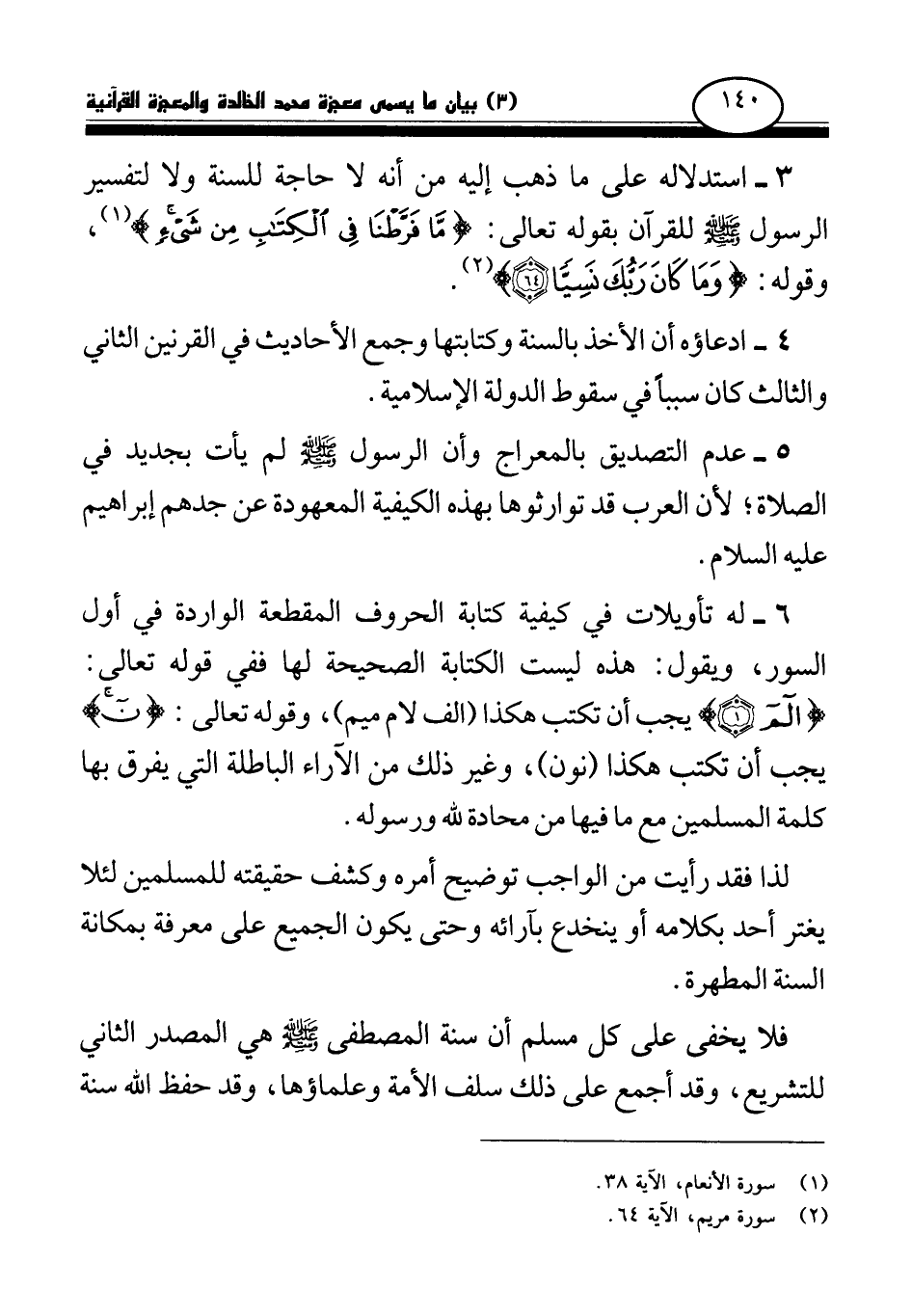 3 - استدلاله على ما ذهب إليه من أنه لا حاجة للسنة ولا لتفسير الرسول صلى الله عليه وسلم للقرآن بقوله تعالى: {مَا فَرَّطْنَا فِي الْكِتَابِ مِنْ شَيْءٍ} (¬1) وقوله: {وَمَا كَانَ رَبُّكَ نَسِيًّا} (¬2) 4 - ادعاؤه أن الأخذ بالسنة وكتابتها وجمع الأحاديث في القرنين الثاني والثالث كان سببا في سقوط الدولة الإسلامية.