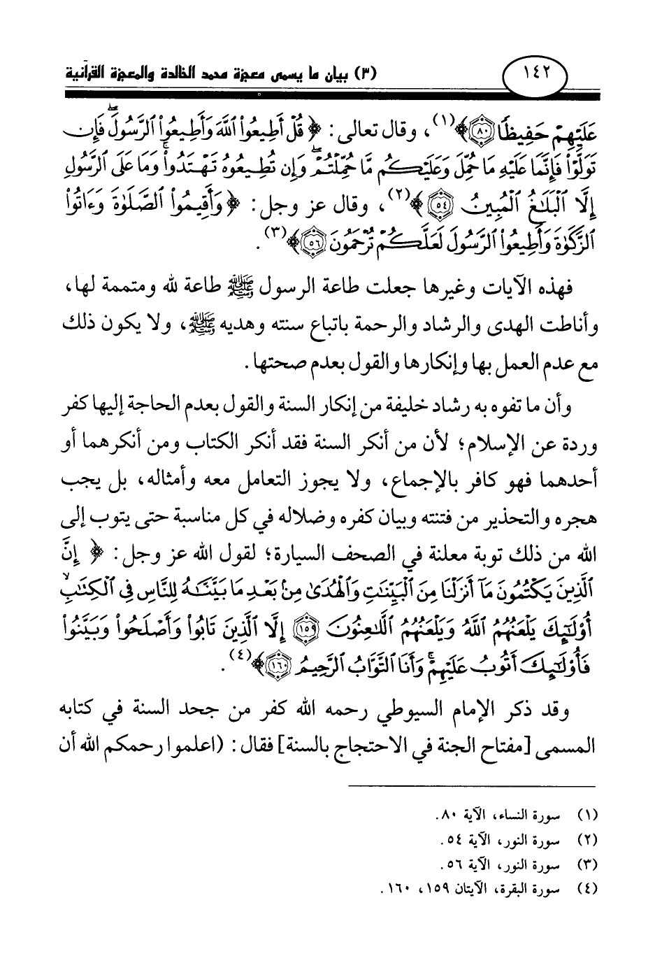 وقد ذكر الإمام السيوطي رحمه الله كفر من جحد السنة في كتابه المسمى [مفتاح الجنة في الاحتجاج بالسنة] ، فقال: (اعلموا رحمكم الله أن